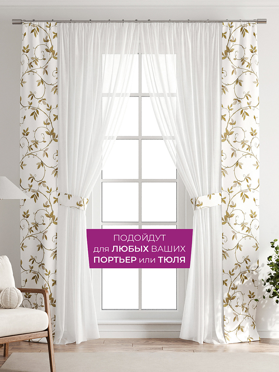 В комплект входят две узкие шторы шириной всего 38 см и длиной 260 см., которые навешиваются рядом с вашими занавесками или тюлем не утяжеляя вид окна и не препятствуя попаданию солнечного света в комнату. При этом выполняют роль подхватов и добавляют акцент в интерьер.