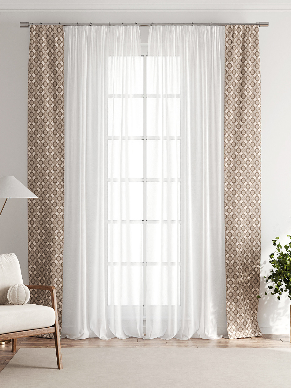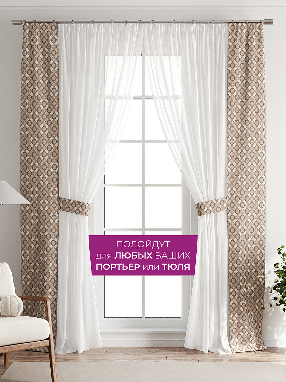 В комплект входят две узкие шторы шириной всего 38 см и длиной 260 см., которые навешиваются рядом с вашими занавесками или тюлем не утяжеляя вид окна и не препятствуя попаданию солнечного света в комнату. При этом выполняют роль подхватов и добавляют акцент в интерьер.