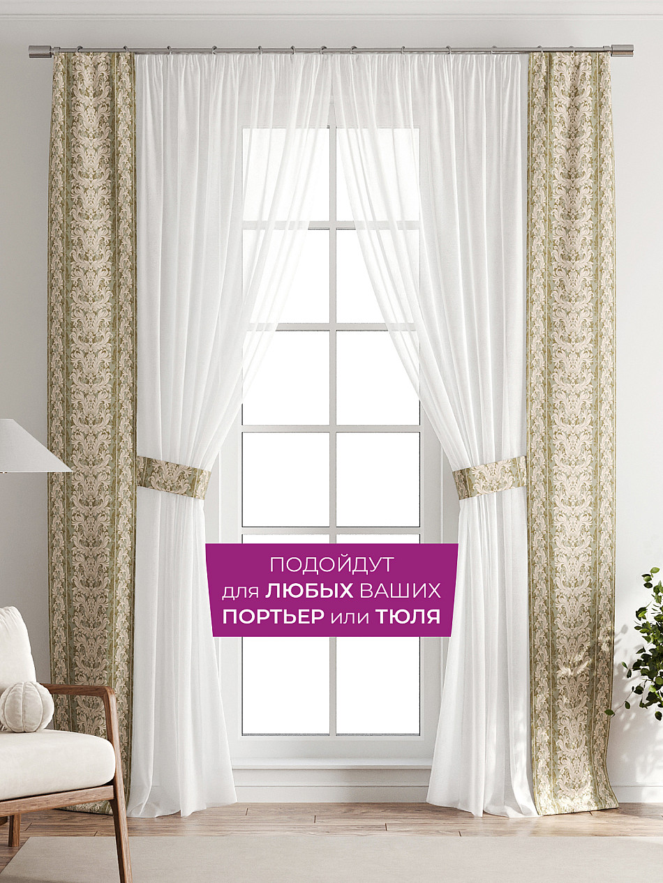 В комплект входят две узкие шторы шириной всего 38 см и длиной 260 см., которые навешиваются рядом с вашими занавесками или тюлем не утяжеляя вид окна и не препятствуя попаданию солнечного света в комнату. При этом выполняют роль подхватов и добавляют акцент в интерьер.