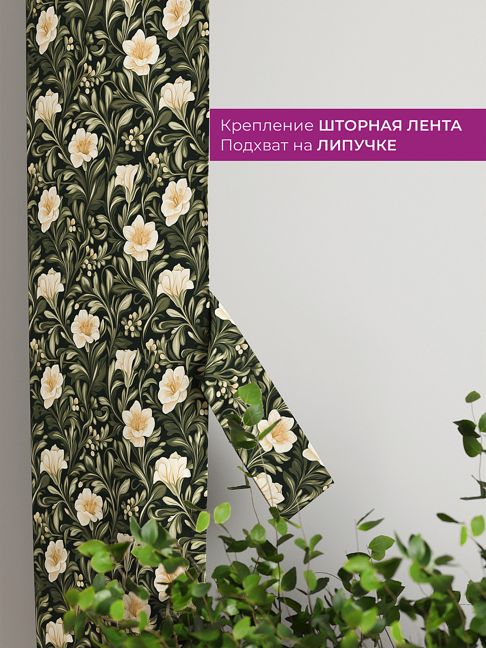 Комплект готов к развешиванию. По верхнему краю пристрочена шторная лента 6 см, с 2-мя рядами петель под крючки, что позволяет регулировать высоту. Одновременно имеется кулиска (карман для штанги), в которую можно продеть карниз любого диаметра.