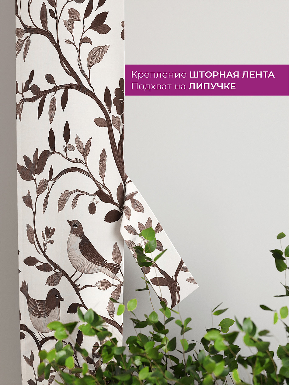 Комплект готов к развешиванию. По верхнему краю пристрочена шторная лента 6 см, с 2-мя рядами петель под крючки, что позволяет регулировать высоту. Одновременно имеется кулиска (карман для штанги), в которую можно продеть карниз любого диаметра.