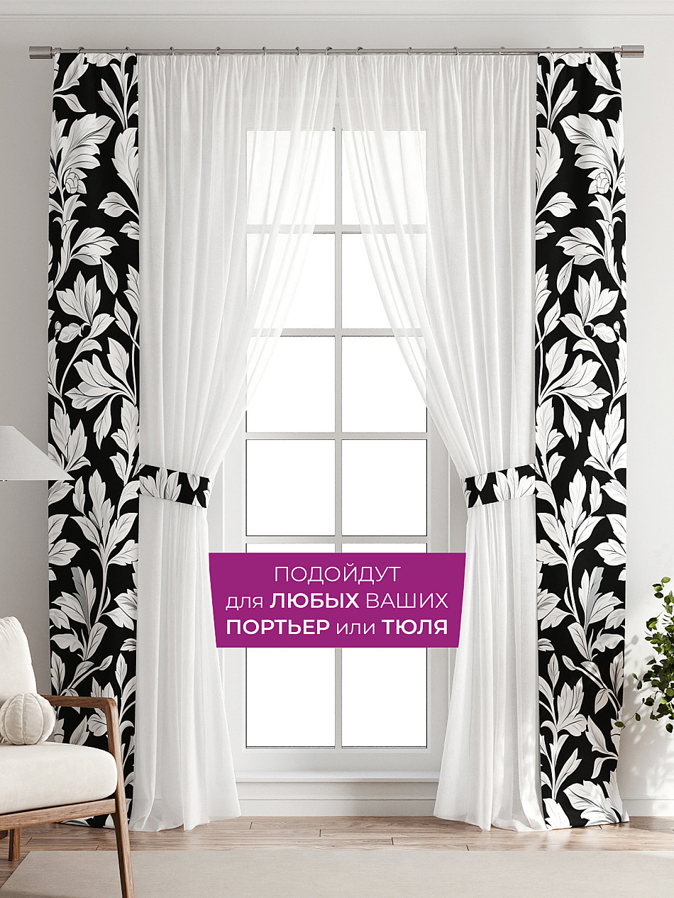 В комплект входят две узкие шторы шириной всего 38 см и длиной 260 см., которые навешиваются рядом с вашими занавесками или тюлем не утяжеляя вид окна и не препятствуя попаданию солнечного света в комнату. При этом выполняют роль подхватов и добавляют акцент в интерьер.