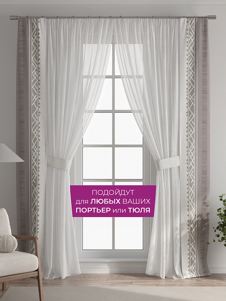В комплект входят две узкие шторы шириной всего 38 см и длиной 260 см., которые навешиваются рядом с вашими занавесками или тюлем не утяжеляя вид окна и не препятствуя попаданию солнечного света в комнату. При этом выполняют роль подхватов и добавляют акцент в интерьер.