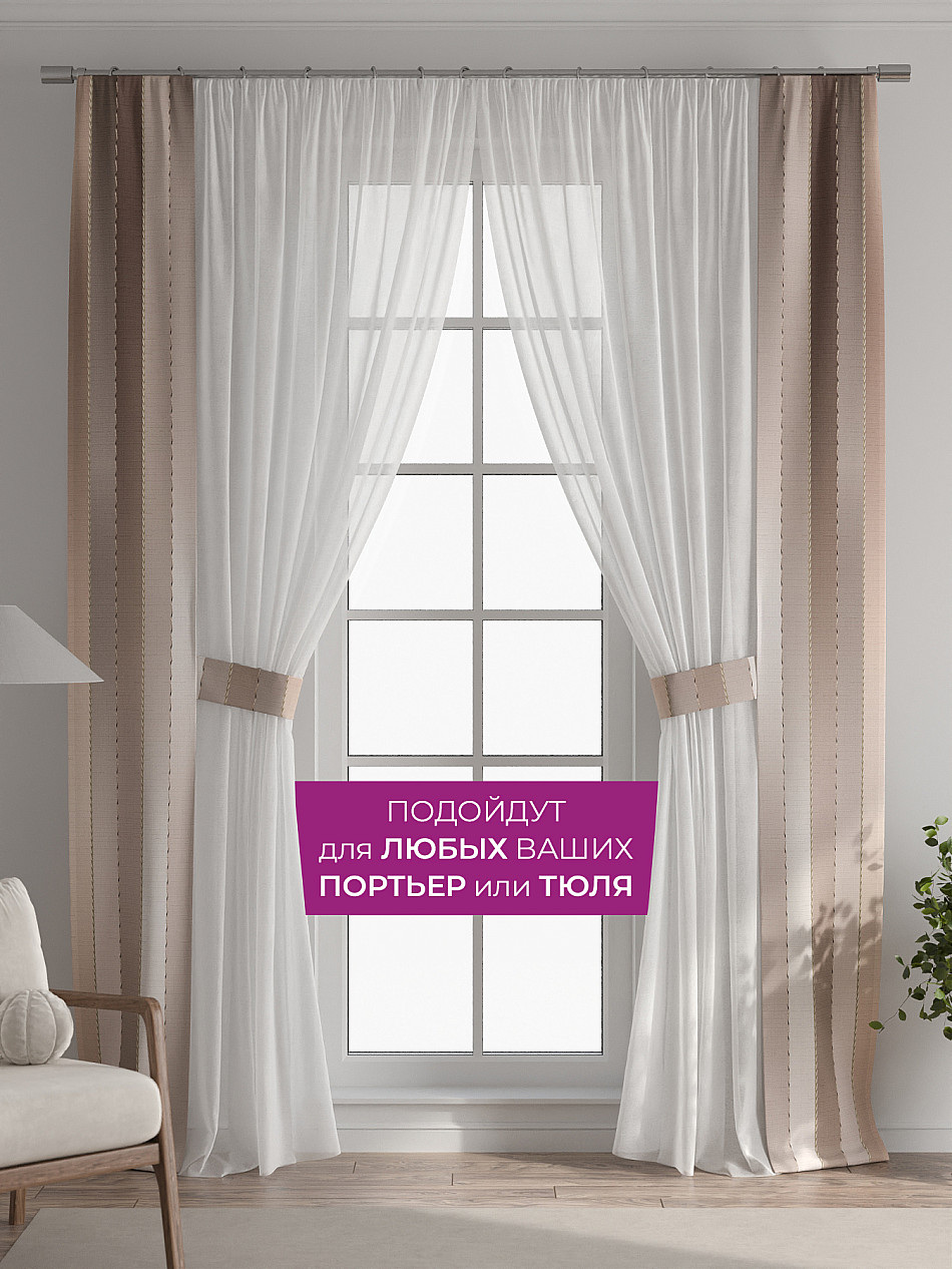 Панели с вшитыми подхватами подходят как для лёгкого тюля, так и для плотных портьер. Дополните тюль на кухне, шторы в гостиной, занавески в детской, портьеры в спальне и ваш интерьер заиграет новыми красками без серьезных вложений, а благодаря тому, что подхват пришит к нашим шторам - вам не нужно сверлить стены, устанавливать крючки или портить оконные рамы. Подхват всегда в нужном месте, не теряется, не смещается и обеспечивает аккуратную фиксацию.