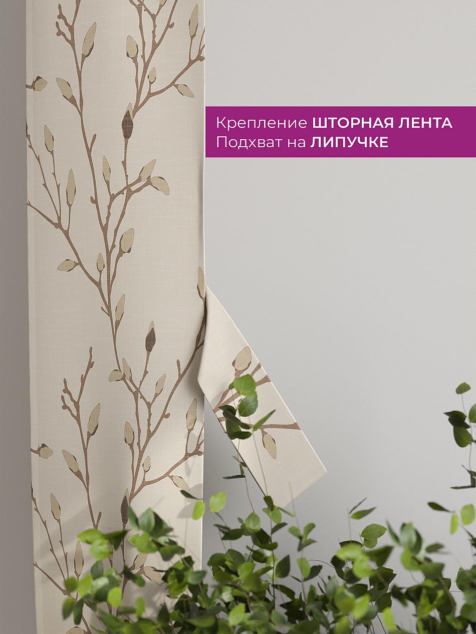 Комплект готов к развешиванию. По верхнему краю пристрочена шторная лента 6 см, с 2-мя рядами петель под крючки, что позволяет регулировать высоту. Одновременно имеется кулиска (карман для штанги), в которую можно продеть карниз любого диаметра.