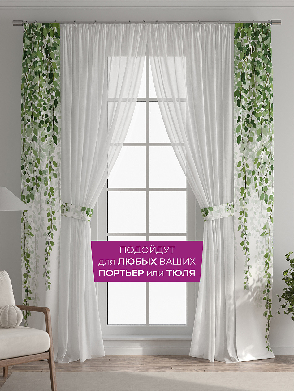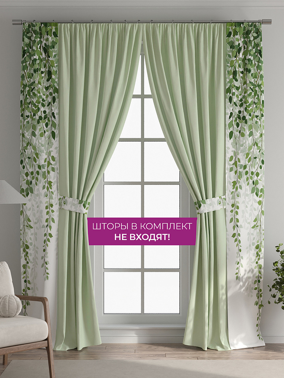 В комплект входят две узкие шторы шириной всего 38 см и длиной 260 см., которые навешиваются рядом с вашими занавесками или тюлем не утяжеляя вид окна и не препятствуя попаданию солнечного света в комнату. При этом выполняют роль подхватов и добавляют акцент в интерьер.