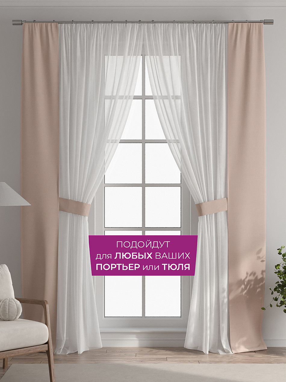 В комплект входят две узкие шторы шириной всего 38 см и длиной 260 см., которые навешиваются рядом с вашими занавесками или тюлем не утяжеляя вид окна и не препятствуя попаданию солнечного света в комнату. При этом выполняют роль подхватов и добавляют акцент в интерьер.