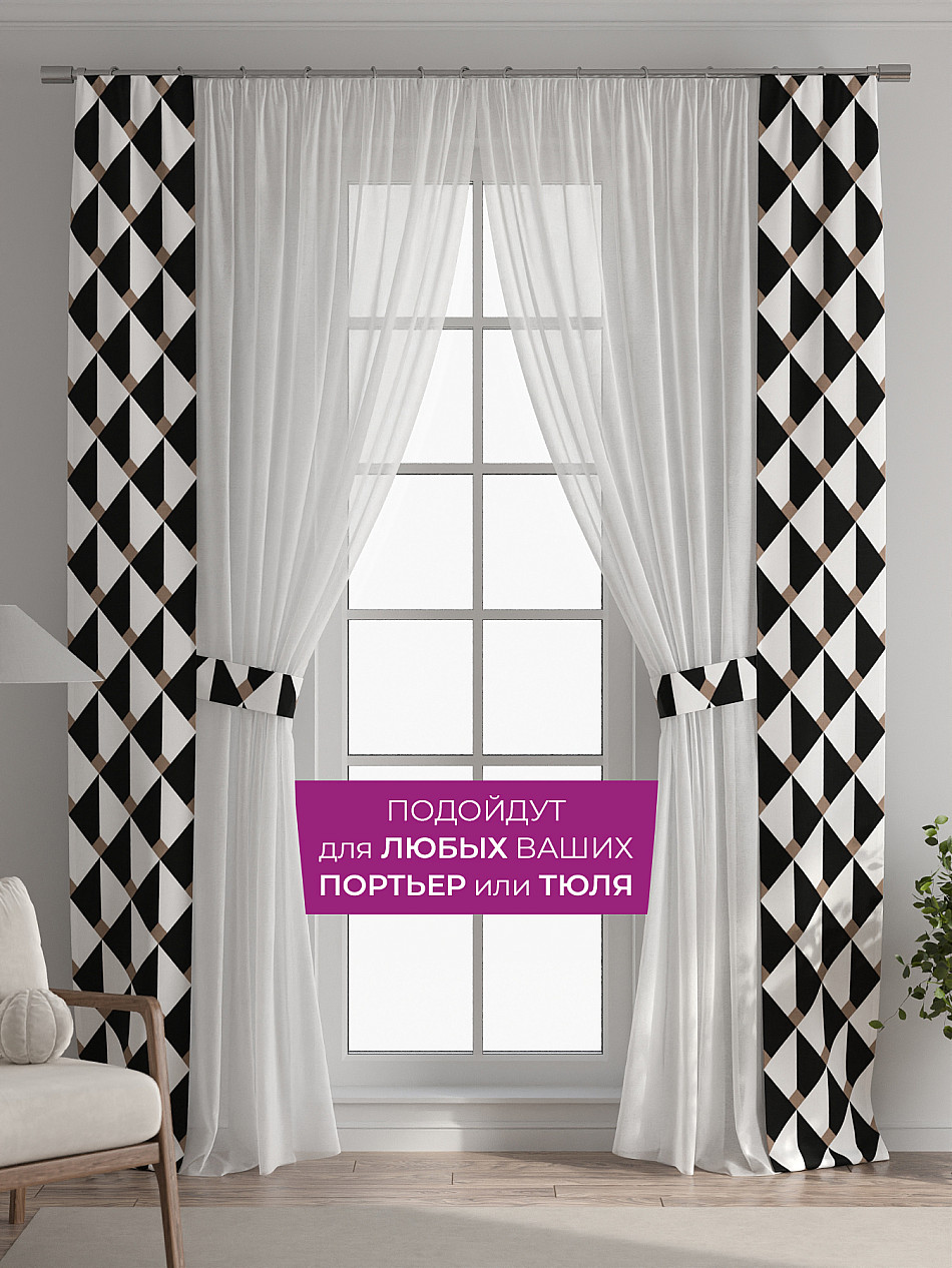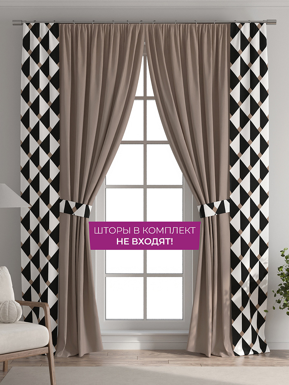 В комплект входят две узкие шторы шириной всего 38 см и длиной 260 см., которые навешиваются рядом с вашими занавесками или тюлем не утяжеляя вид окна и не препятствуя попаданию солнечного света в комнату. При этом выполняют роль подхватов и добавляют акцент в интерьер.