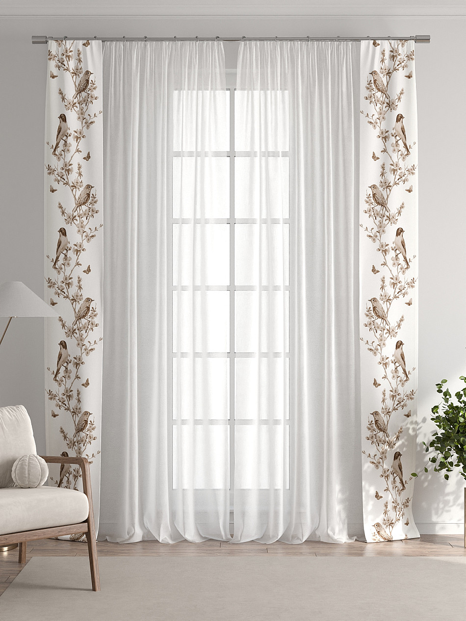 Комплект готов к развешиванию. По верхнему краю пристрочена шторная лента 6 см, с 2-мя рядами петель под крючки, что позволяет регулировать высоту. Одновременно имеется кулиска (карман для штанги), в которую можно продеть карниз любого диаметра.