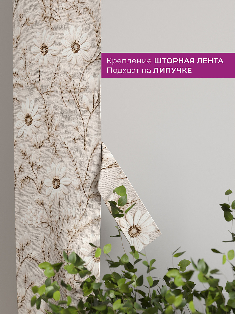 На высоте 125 см. пришит подхват (ширина 10 см.), который позволяет легко зафиксировать ваш тюль или шторы в нужном положении при помощи липучки.