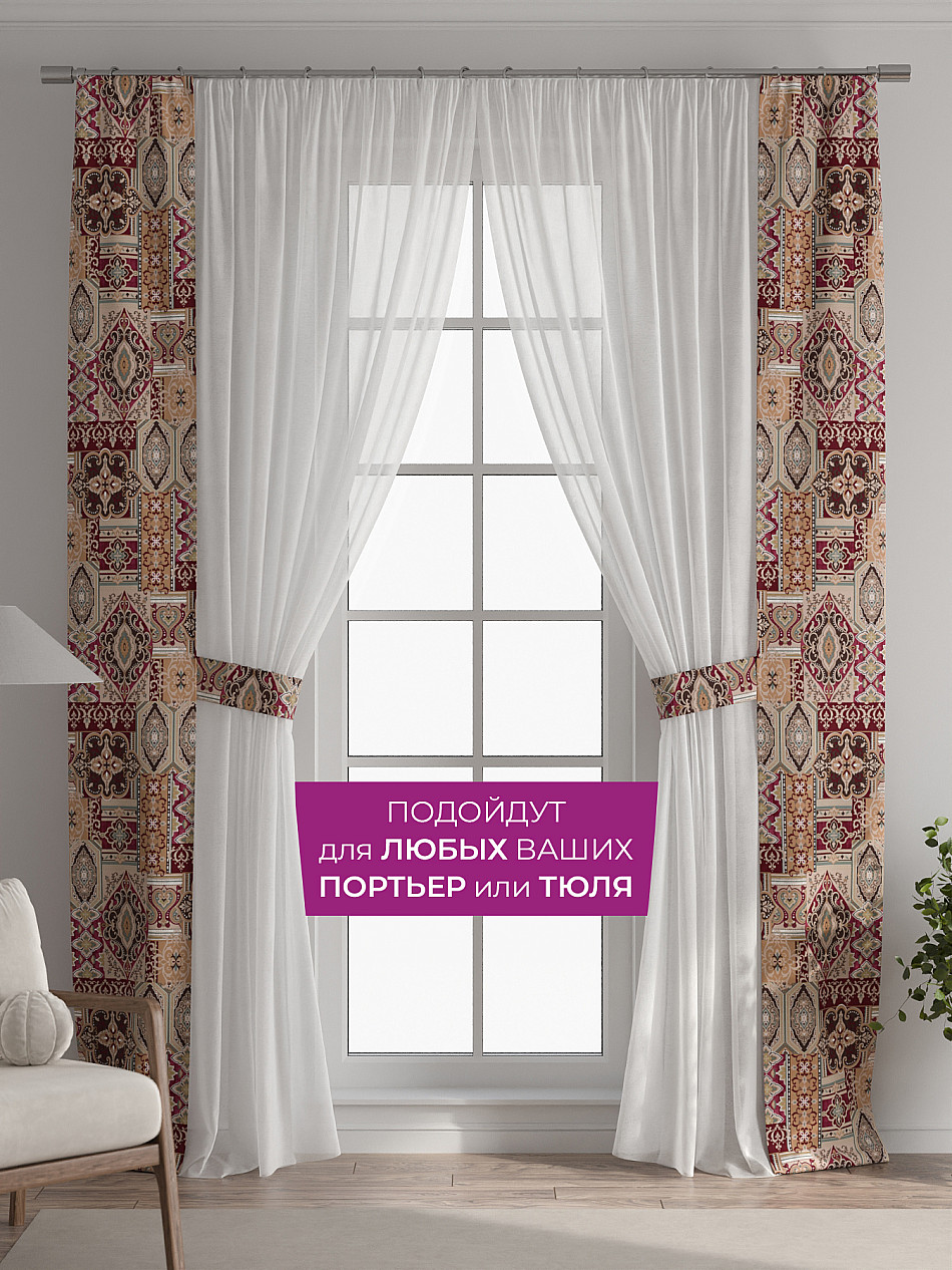 В комплект входят две узкие шторы шириной всего 38 см и длиной 260 см., которые навешиваются рядом с вашими занавесками или тюлем не утяжеляя вид окна и не препятствуя попаданию солнечного света в комнату. При этом выполняют роль подхватов и добавляют акцент в интерьер.