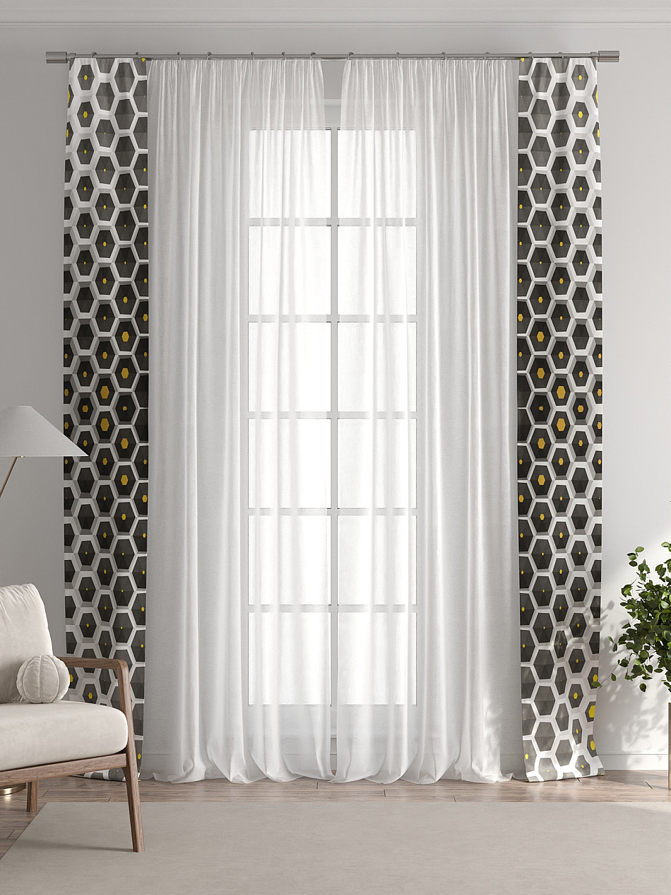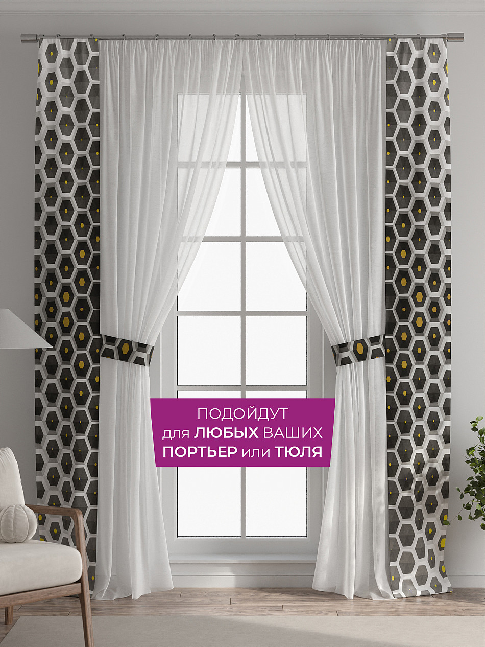 В комплект входят две узкие шторы шириной всего 38 см и длиной 260 см., которые навешиваются рядом с вашими занавесками или тюлем не утяжеляя вид окна и не препятствуя попаданию солнечного света в комнату. При этом выполняют роль подхватов и добавляют акцент в интерьер.