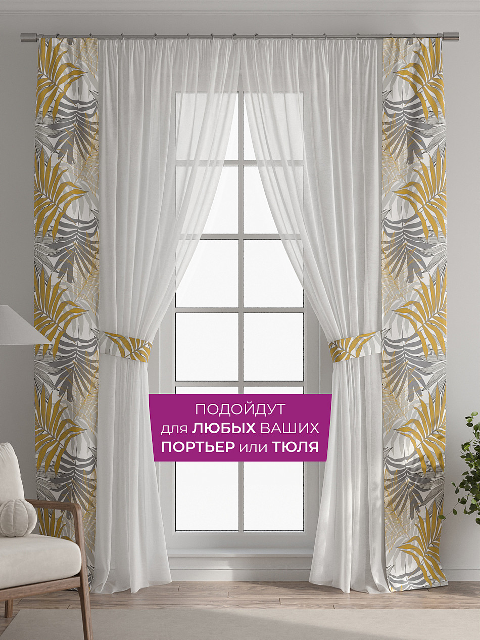 В комплект входят две узкие шторы шириной всего 38 см и длиной 260 см., которые навешиваются рядом с вашими занавесками или тюлем не утяжеляя вид окна и не препятствуя попаданию солнечного света в комнату. При этом выполняют роль подхватов и добавляют акцент в интерьер.