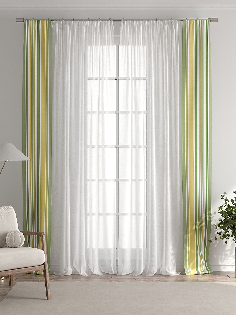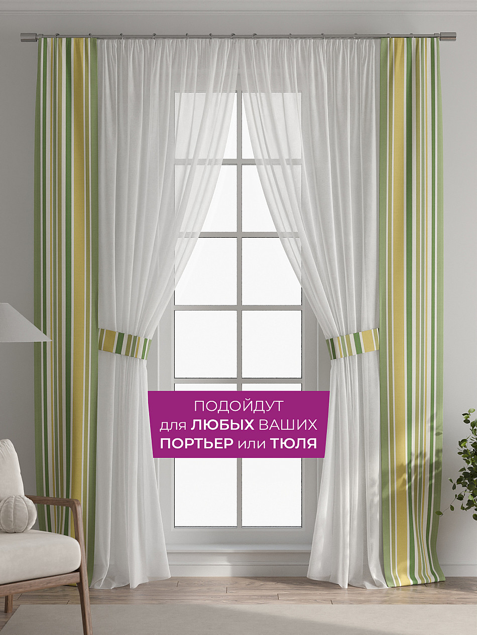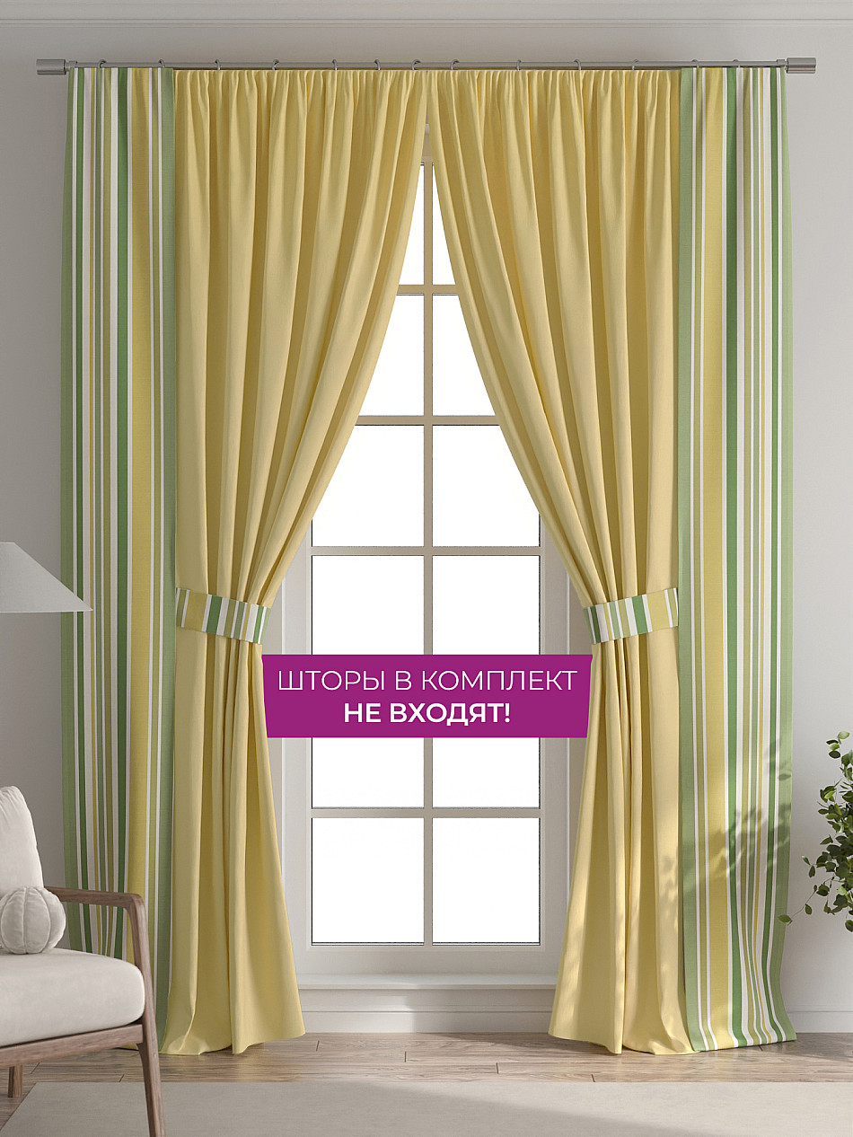 В комплект входят две узкие шторы шириной всего 38 см и длиной 260 см., которые навешиваются рядом с вашими занавесками или тюлем не утяжеляя вид окна и не препятствуя попаданию солнечного света в комнату. При этом выполняют роль подхватов и добавляют акцент в интерьер.