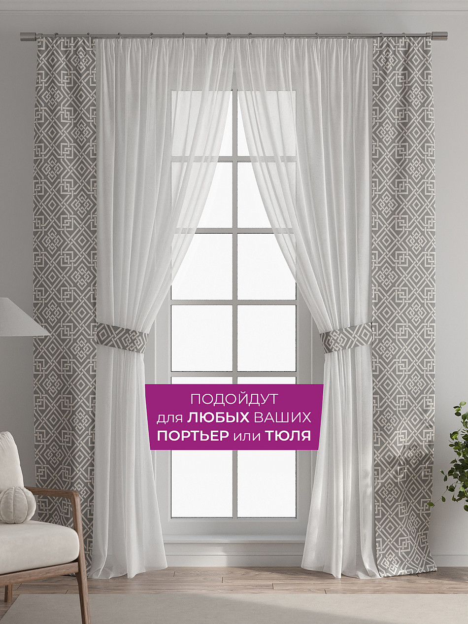 В комплект входят две узкие шторы шириной всего 38 см и длиной 260 см., которые навешиваются рядом с вашими занавесками или тюлем не утяжеляя вид окна и не препятствуя попаданию солнечного света в комнату. При этом выполняют роль подхватов и добавляют акцент в интерьер.