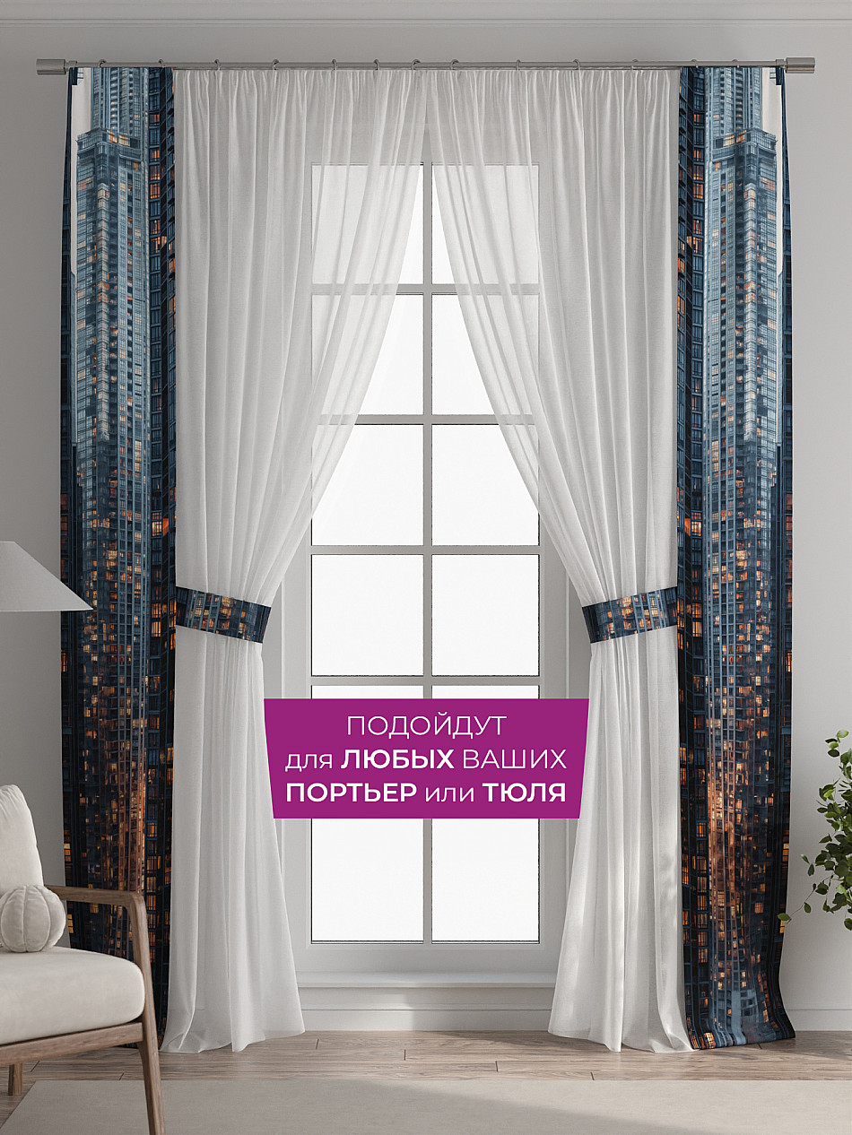 В комплект входят две узкие шторы шириной всего 38 см и длиной 260 см., которые навешиваются рядом с вашими занавесками или тюлем не утяжеляя вид окна и не препятствуя попаданию солнечного света в комнату. При этом выполняют роль подхватов и добавляют акцент в интерьер.