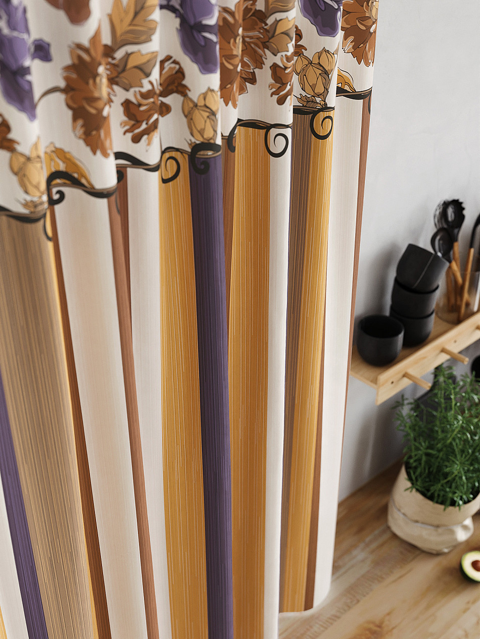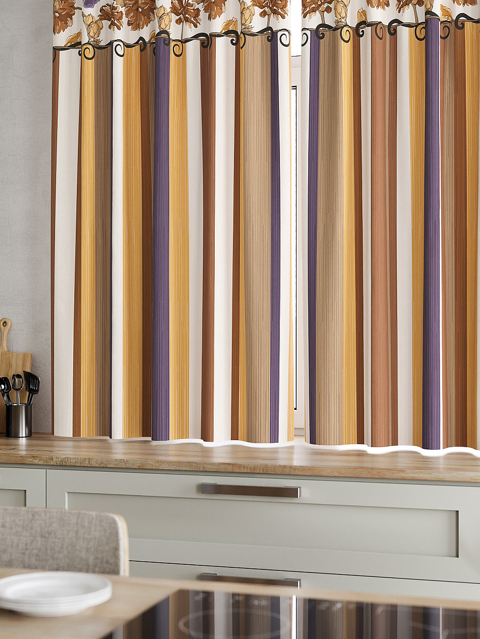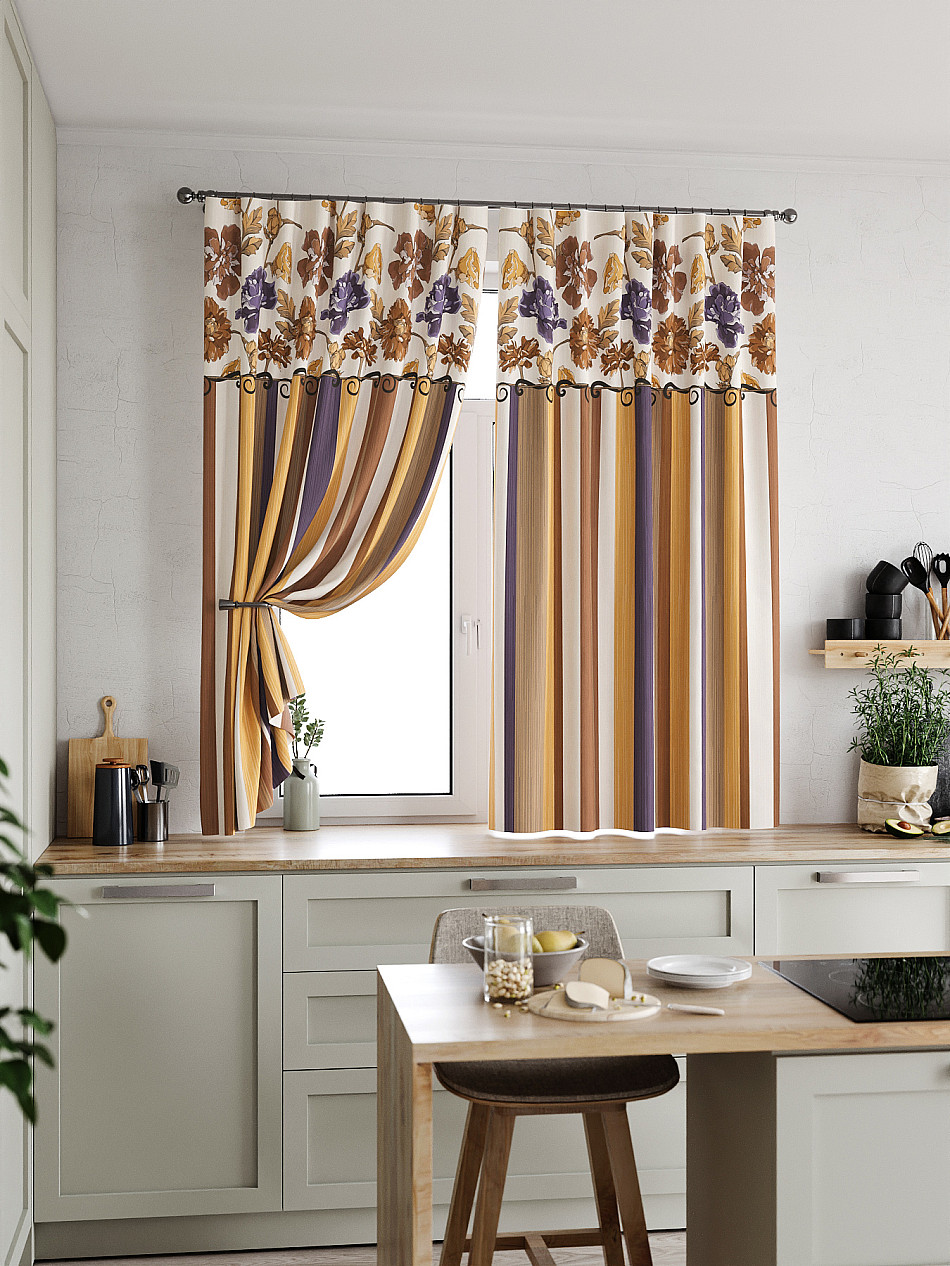 Комплект штор из легкой портьерной ткани (габардин) оформлен печатным рисунком. Печатный рисунок дает широкие возможности обновить интерьер фактически нет требуя ремонта за счет огромного выбора. Ткани с печатным рисунком безопасны и не содержат токсичных веществ. Не смотря на то что, материал легкий, он имеет высокую плотность, мало загрязнятся и не требует особого ухода даже после стирки, что важно для кухонных занавесок. Шторы не выцветают, не растягиваются, превосходно драпируются, образуя струящиеся складки. Прекрасное решение для создания красоты и уюта с помощью уникальных дизайнов.