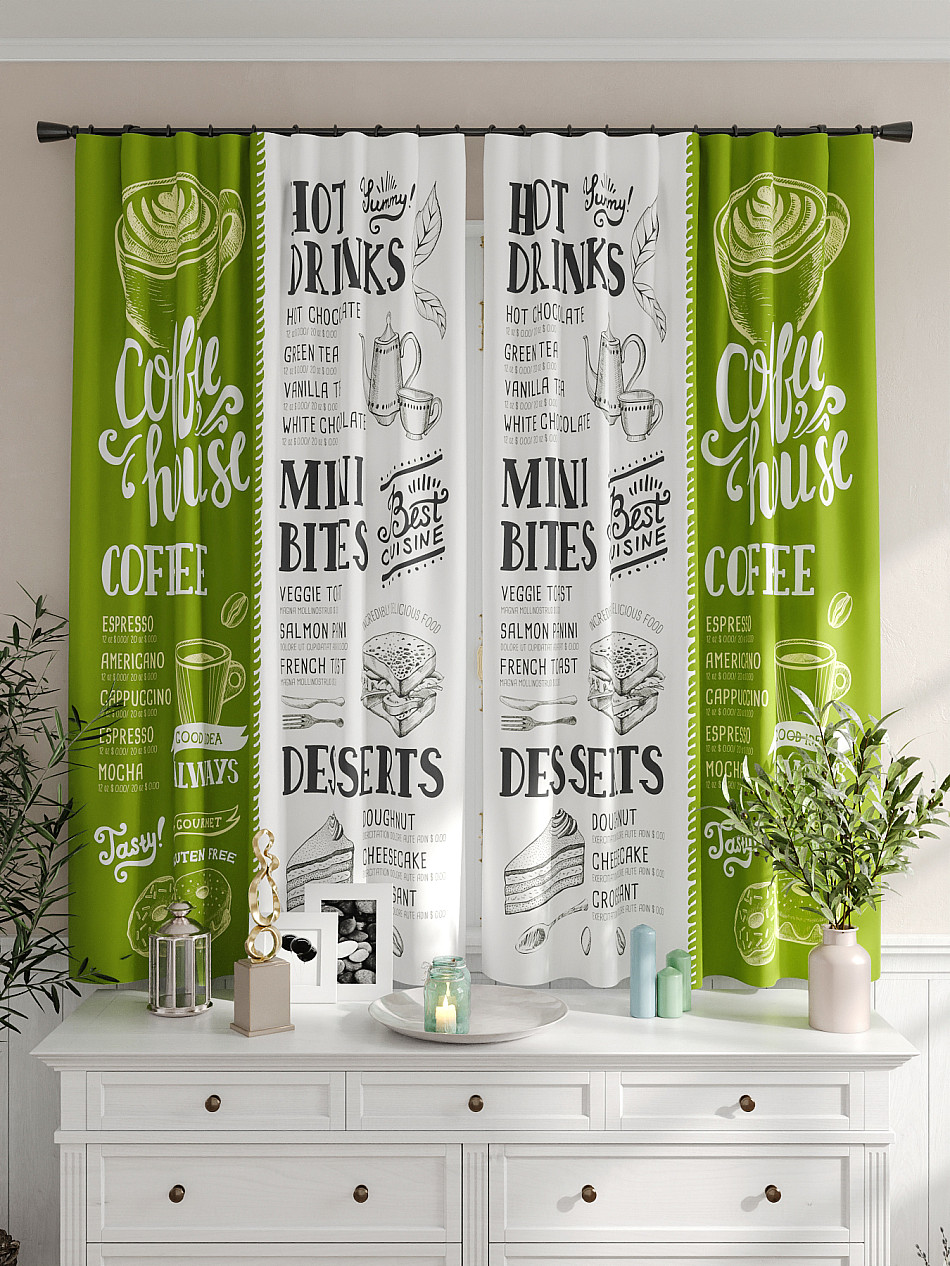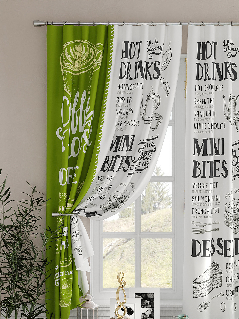 Портьеры 2 шт. Комплект штор из легкой портьерной ткани (габардин) оформлен печатным рисунком. Печатный рисунок дает широкие возможности обновить интерьер фактически не требуя ремонта за счет огромного выбора. Ткани с печатным рисунком безопасны и не содержат токсичных веществ. Не смотря на то, что материал легкий, он имеет высокую плотность, мало загрязнятся и не требует особого ухода даже после стирки, что важно для кухонных занавесок. Шторы не выцветают, не растягиваются, превосходно драпируются, образуя струящиеся складки. Прекрасное решение для создания красоты и уюта с помощью уникальных дизайнов.