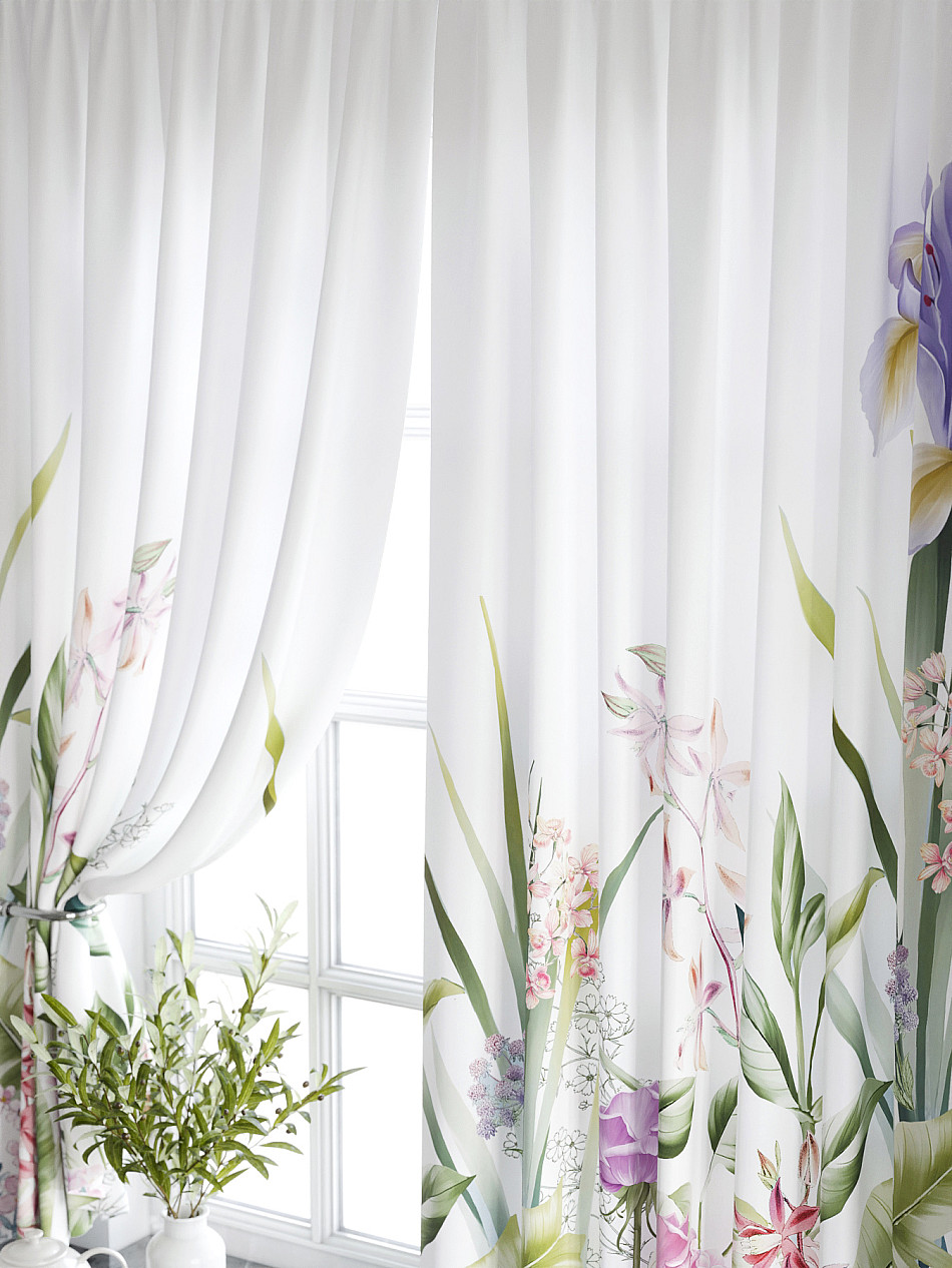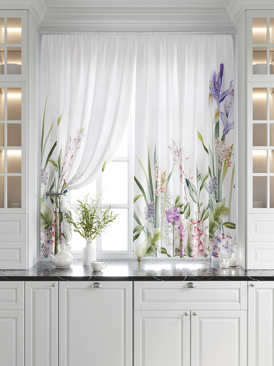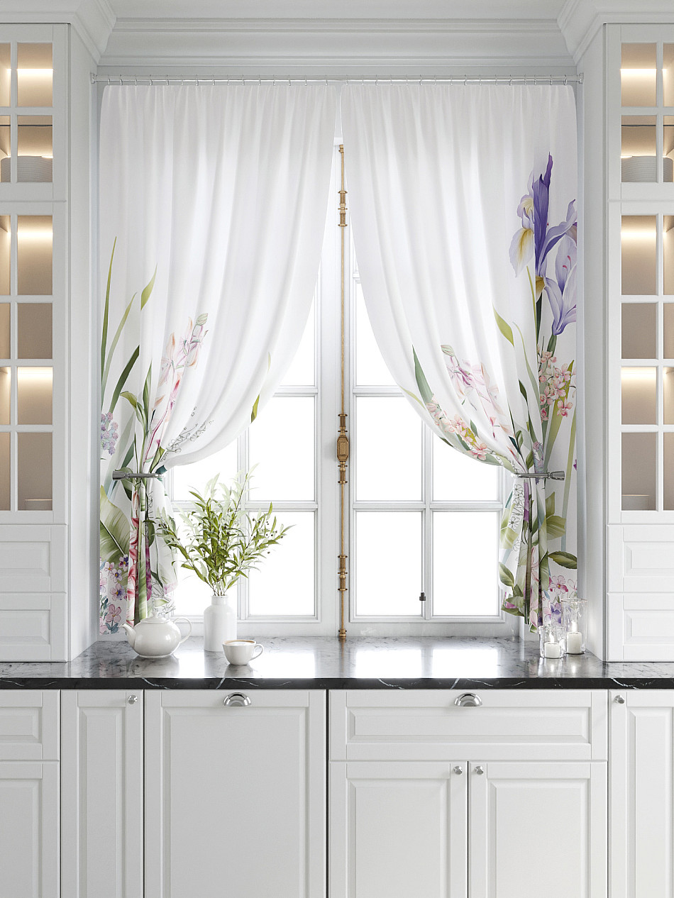 Комплект штор из легкой портьерной ткани (габардин) оформлен печатным рисунком. Печатный рисунок дает широкие возможности обновить интерьер фактически нет требуя ремонта за счет огромного выбора. Ткани с печатным рисунком безопасны и не содержат токсичных веществ. Не смотря на то что, материал легкий, он имеет высокую плотность, мало загрязнятся и не требует особого ухода даже после стирки, что важно для кухонных занавесок. Шторы не выцветают, не растягиваются, превосходно драпируются, образуя струящиеся складки. Прекрасное решение для создания красоты и уюта с помощью уникальных дизайнов.