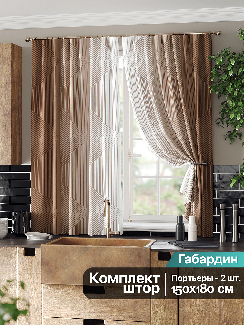 Комплект штор из легкой портьерной ткани (габардин) оформлен печатным рисунком. Печатный рисунок дает широкие возможности обновить интерьер фактически нет требуя ремонта за счет огромного выбора. Ткани с печатным рисунком безопасны и не содержат токсичных веществ. Не смотря на то что, материал легкий, он имеет высокую плотность, мало загрязнятся и не требует особого ухода даже после стирки, что важно для кухонных занавесок. Шторы не выцветают, не растягиваются, превосходно драпируются, образуя струящиеся складки. Прекрасное решение для создания красоты и уюта с помощью уникальных дизайнов.