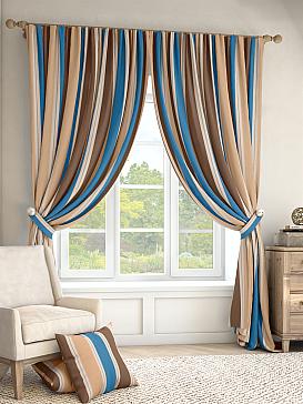 Портьера 2 шт. Подхват - доп.услуга. Легкая основа бежево-коричнево-синего цвета оформлена вертикальной полосой.