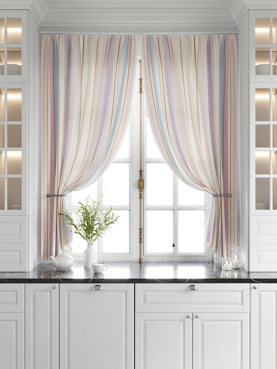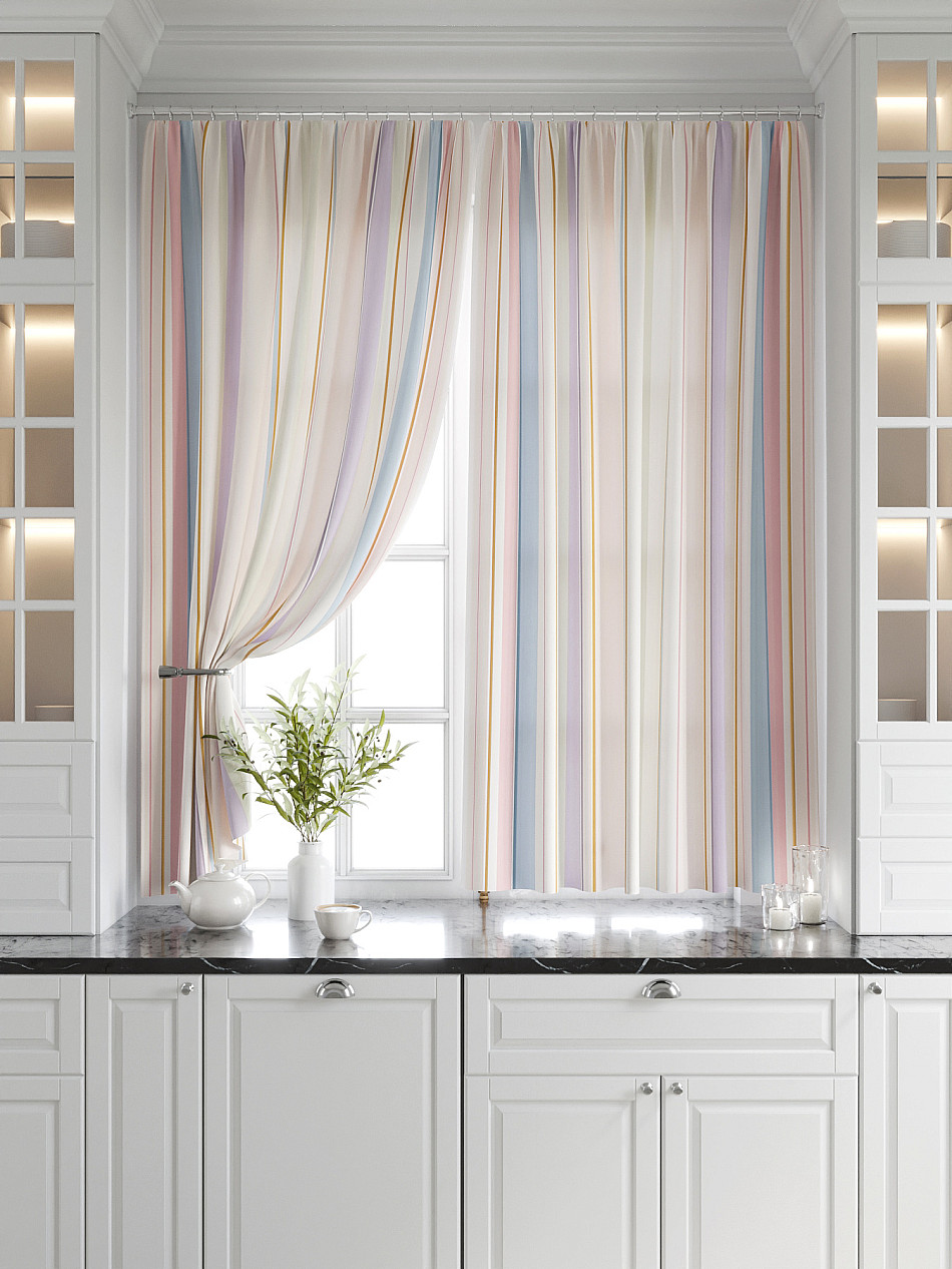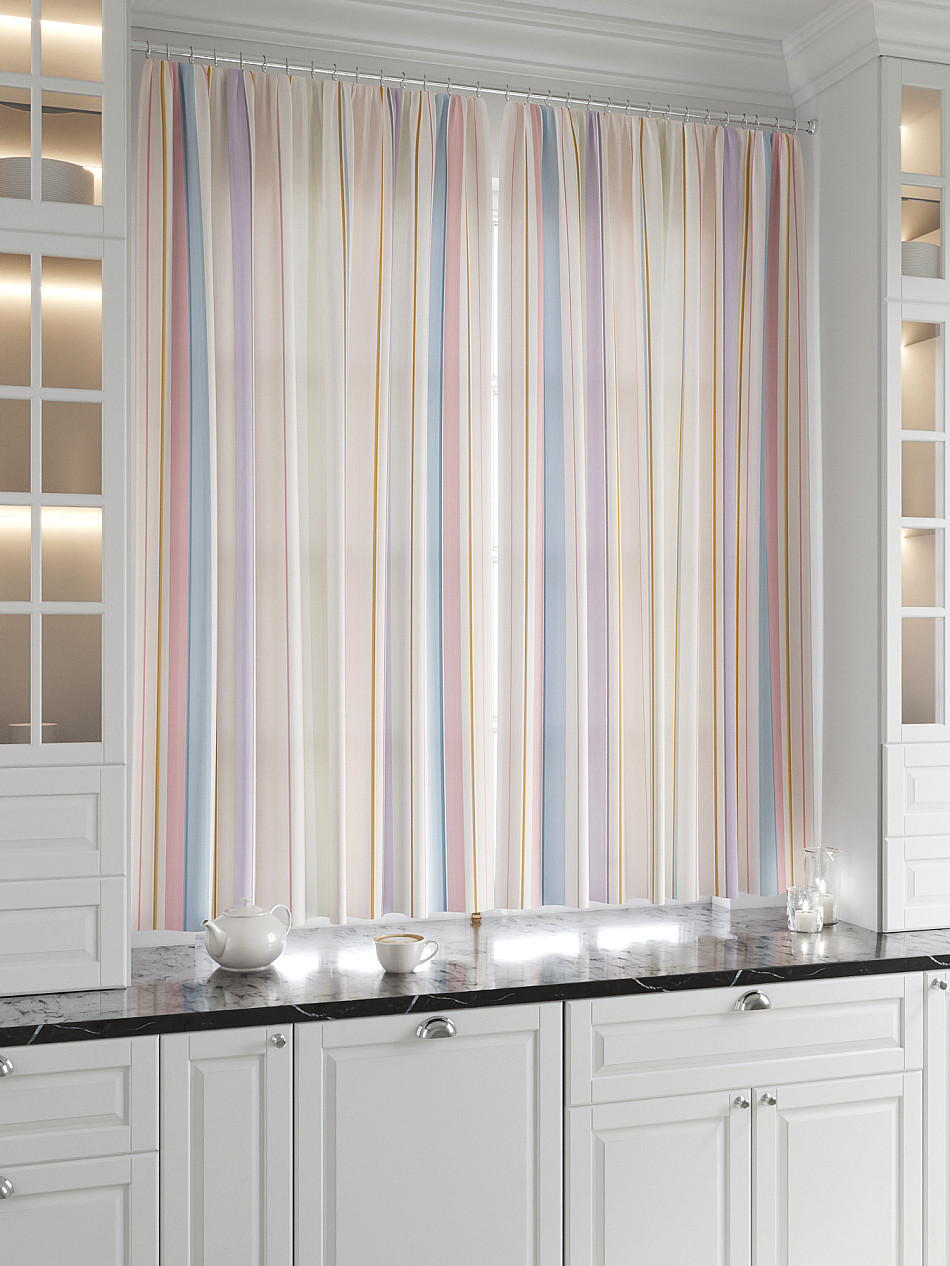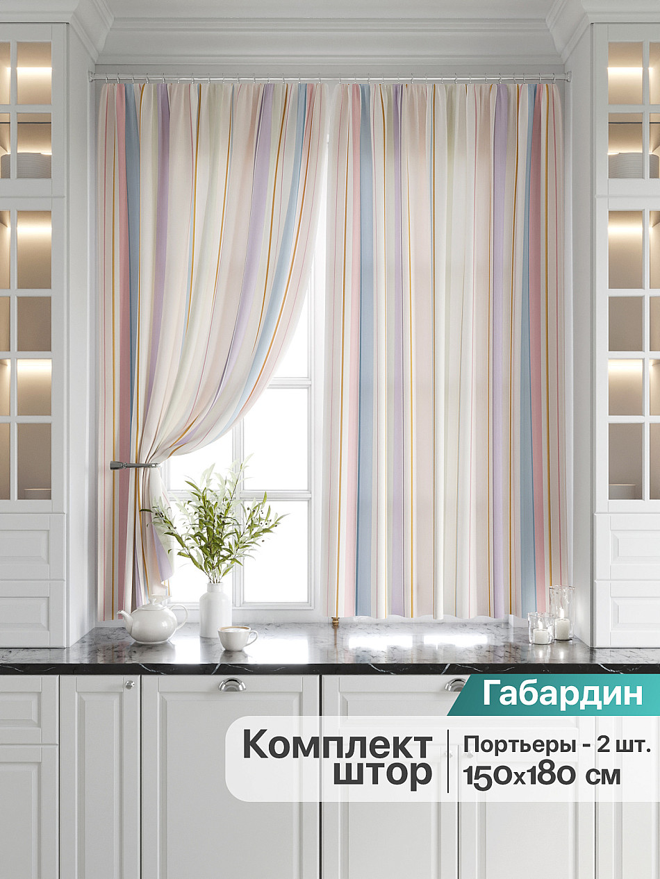 Комплект штор из легкой портьерной ткани (габардин) оформлен печатным рисунком. Печатный рисунок дает широкие возможности обновить интерьер фактически нет требуя ремонта за счет огромного выбора. Ткани с печатным рисунком безопасны и не содержат токсичных веществ. Не смотря на то что, материал легкий, он имеет высокую плотность, мало загрязнятся и не требует особого ухода даже после стирки, что важно для кухонных занавесок. Шторы не выцветают, не растягиваются, превосходно драпируются, образуя струящиеся складки. Прекрасное решение для создания красоты и уюта с помощью уникальных дизайнов.