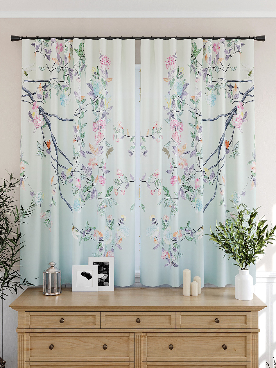 Портьеры 2 шт: Комплект штор из легкой портьерной ткани (габардин) оформлен печатным рисунком. Печатный рисунок дает широкие возможности обновить интерьер фактически нет требуя ремонта за счет огромного выбора. Ткани с печатным рисунком безопасны и не содержат токсичных веществ. Не смотря на то что, материал легкий, он имеет высокую плотность, мало загрязнятся и не требует особого ухода даже после стирки, что важно для кухонных занавесок. Шторы не выцветают, не растягиваются, превосходно драпируются, образуя струящиеся складки. Прекрасное решение для создания красоты и уюта с помощью уникальных дизайнов.