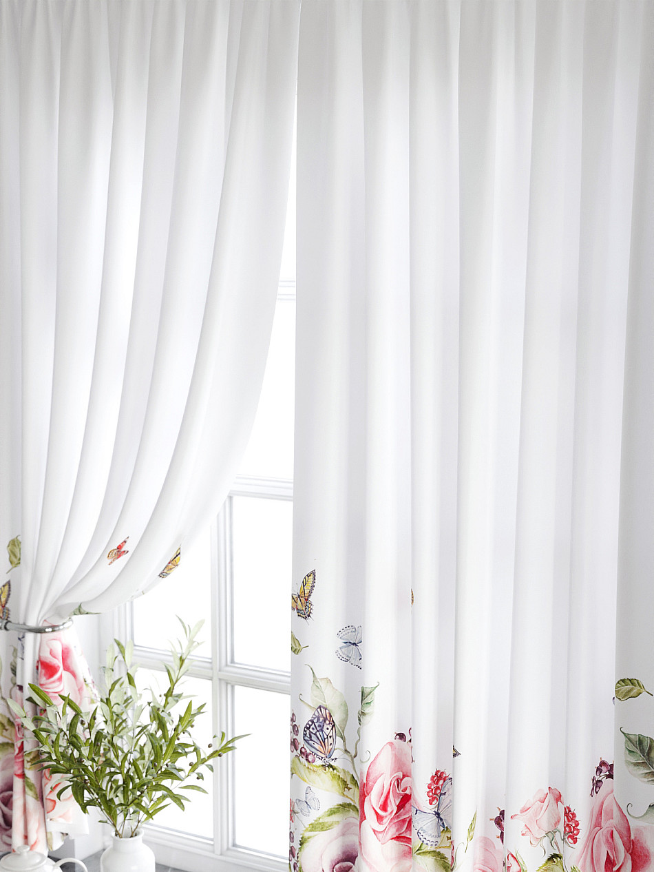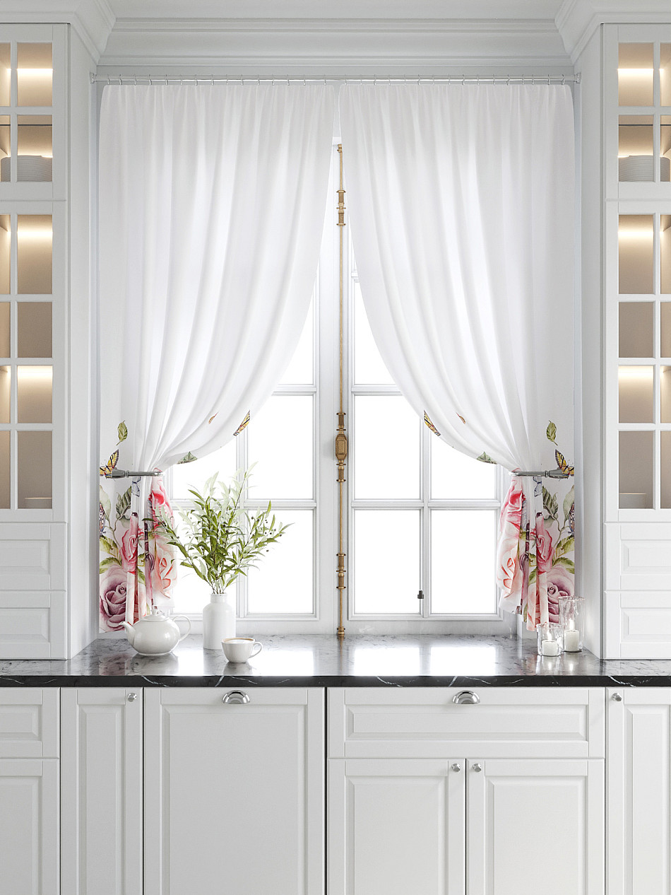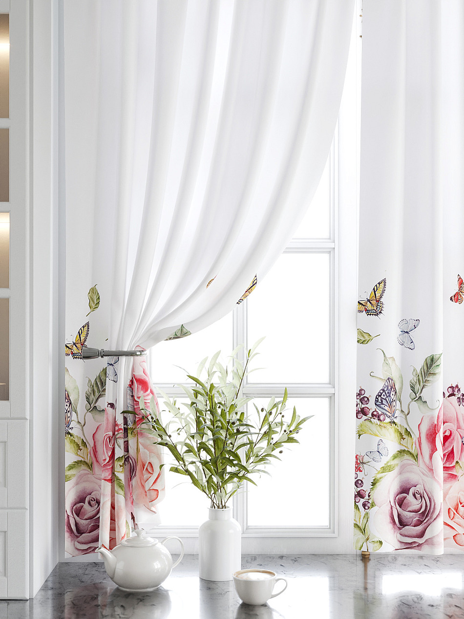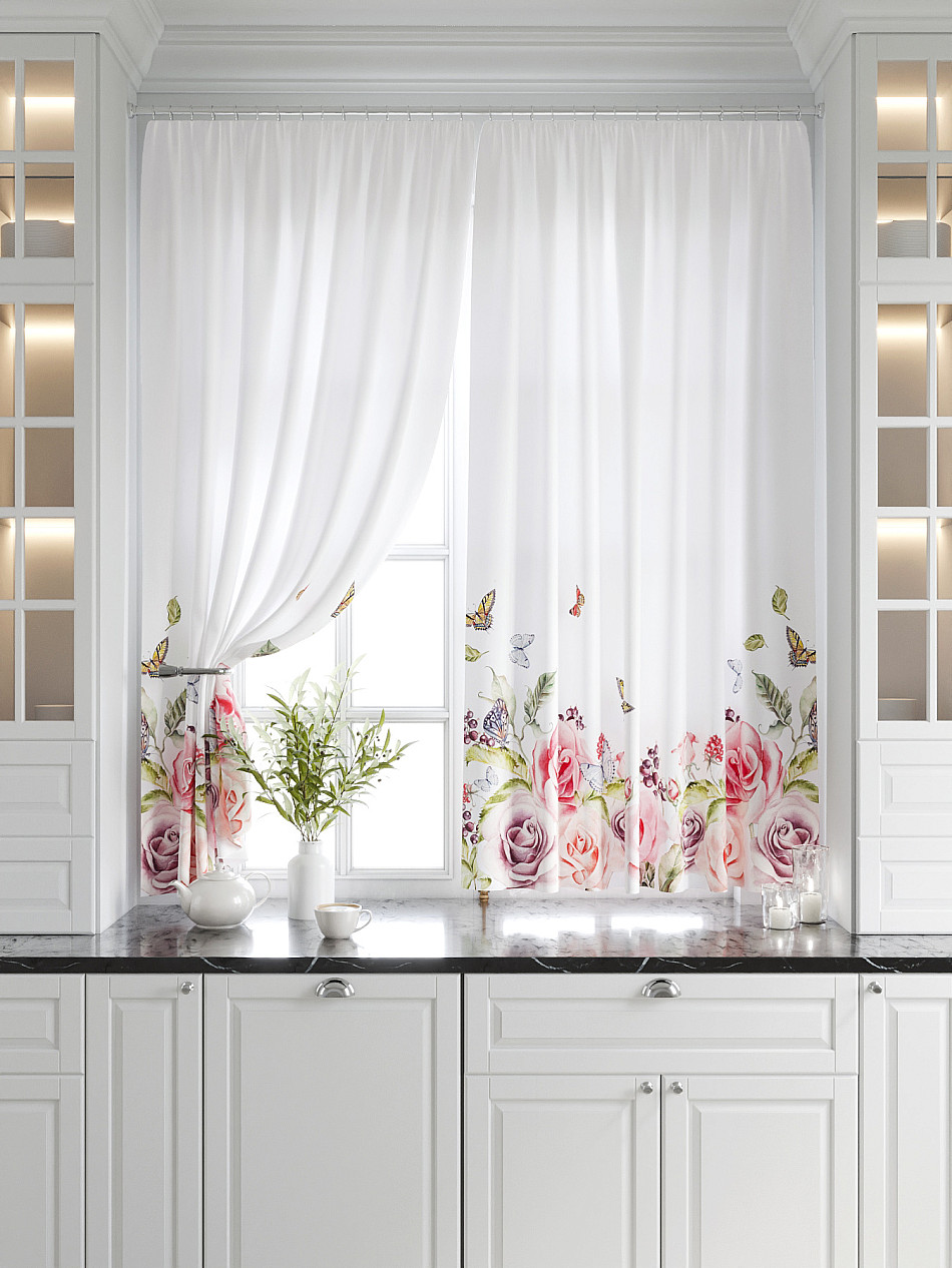 Комплект штор из легкой портьерной ткани (габардин) оформлен печатным рисунком. Печатный рисунок дает широкие возможности обновить интерьер фактически нет требуя ремонта за счет огромного выбора. Ткани с печатным рисунком безопасны и не содержат токсичных веществ. Не смотря на то что, материал легкий, он имеет высокую плотность, мало загрязнятся и не требует особого ухода даже после стирки, что важно для кухонных занавесок. Шторы не выцветают, не растягиваются, превосходно драпируются, образуя струящиеся складки. Прекрасное решение для создания красоты и уюта с помощью уникальных дизайнов.
