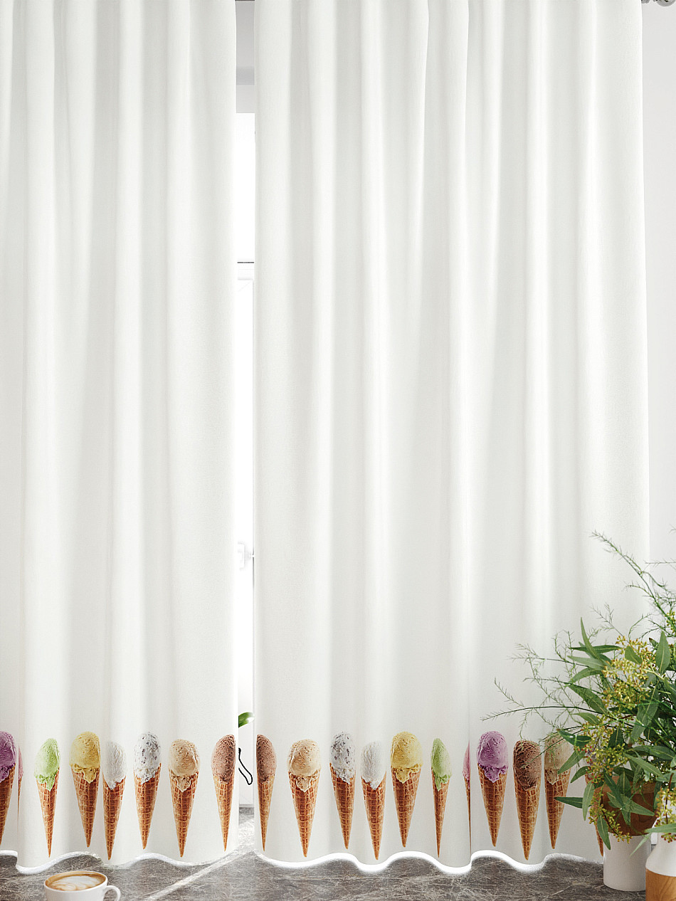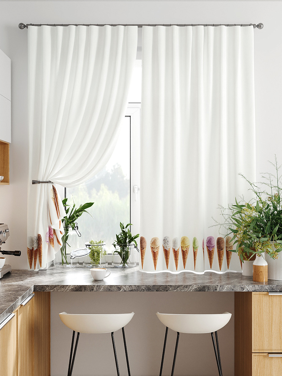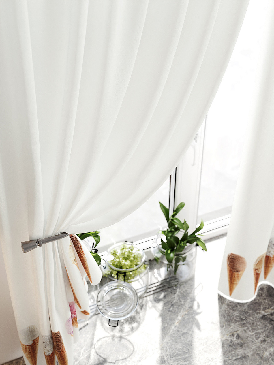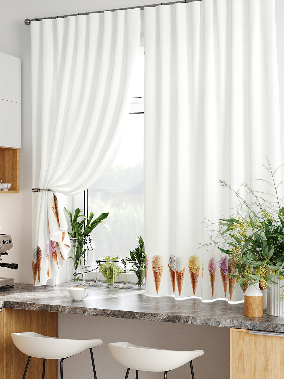 Комплект штор из легкой портьерной ткани (габардин) оформлен печатным рисунком. Печатный рисунок дает широкие возможности обновить интерьер фактически нет требуя ремонта за счет огромного выбора. Ткани с печатным рисунком безопасны и не содержат токсичных веществ. Не смотря на то что, материал легкий, он имеет высокую плотность, мало загрязнятся и не требует особого ухода даже после стирки, что важно для кухонных занавесок. Шторы не выцветают, не растягиваются, превосходно драпируются, образуя струящиеся складки. Прекрасное решение для создания красоты и уюта с помощью уникальных дизайнов.