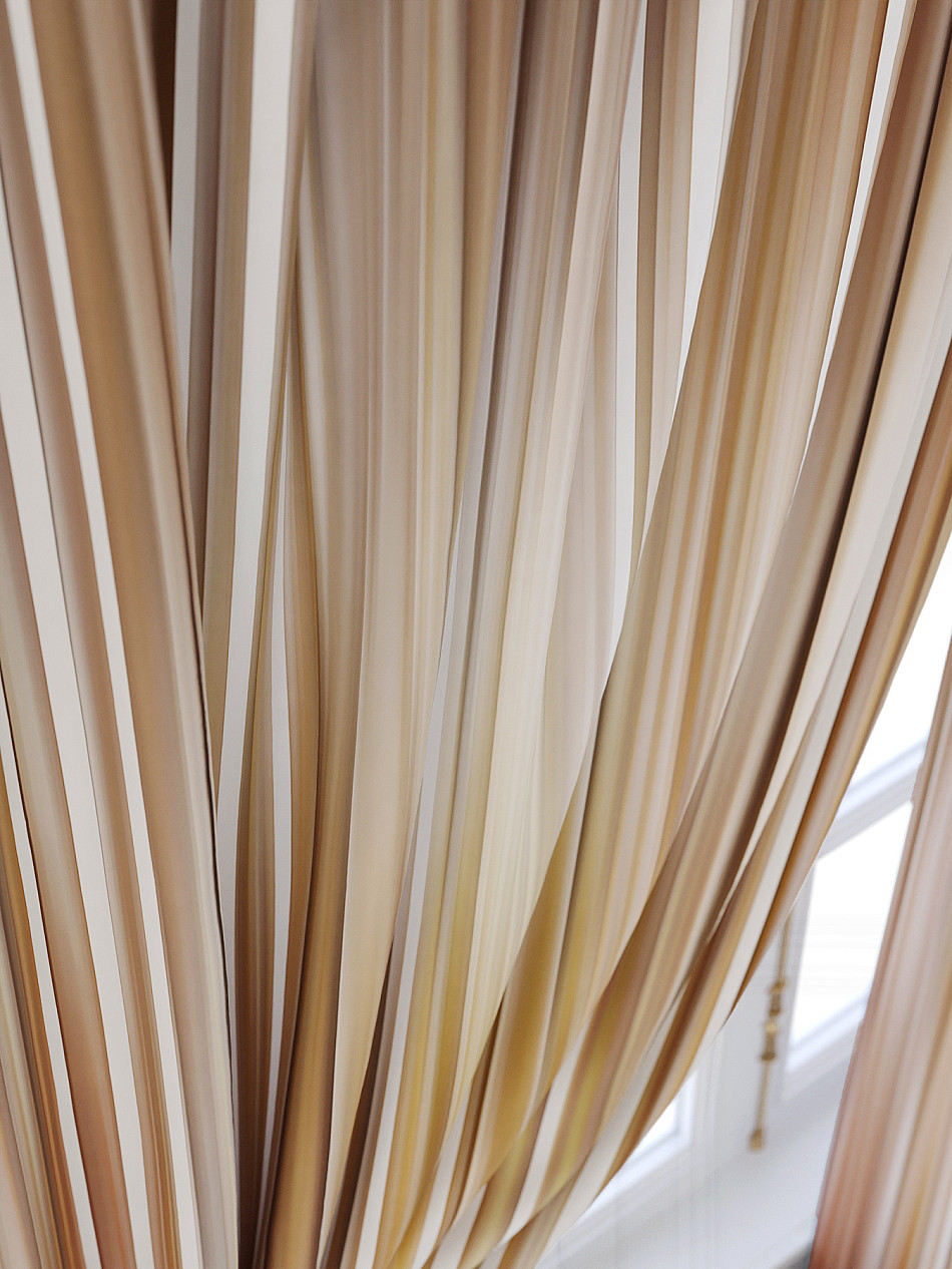 По верхнему краю портьер пришита шторная тесьма 6 см, с ее помощью затянув узелки от кордовых нитей с обеих сторон и стянув их до нужного размера можно сформировать округлые складки, далее вставить крючки в кармашки и повесить на карниз. Обязательно проверьте кордовые нити – они должны быть надежно завязаны, в противном случае во время стягивания они могут вылететь. Шторная тесьма имеет два ряда кармашков, с их помощью можно регулировать не только длину, но и ширину. Такое крепление подходит для всех типов карнизов.