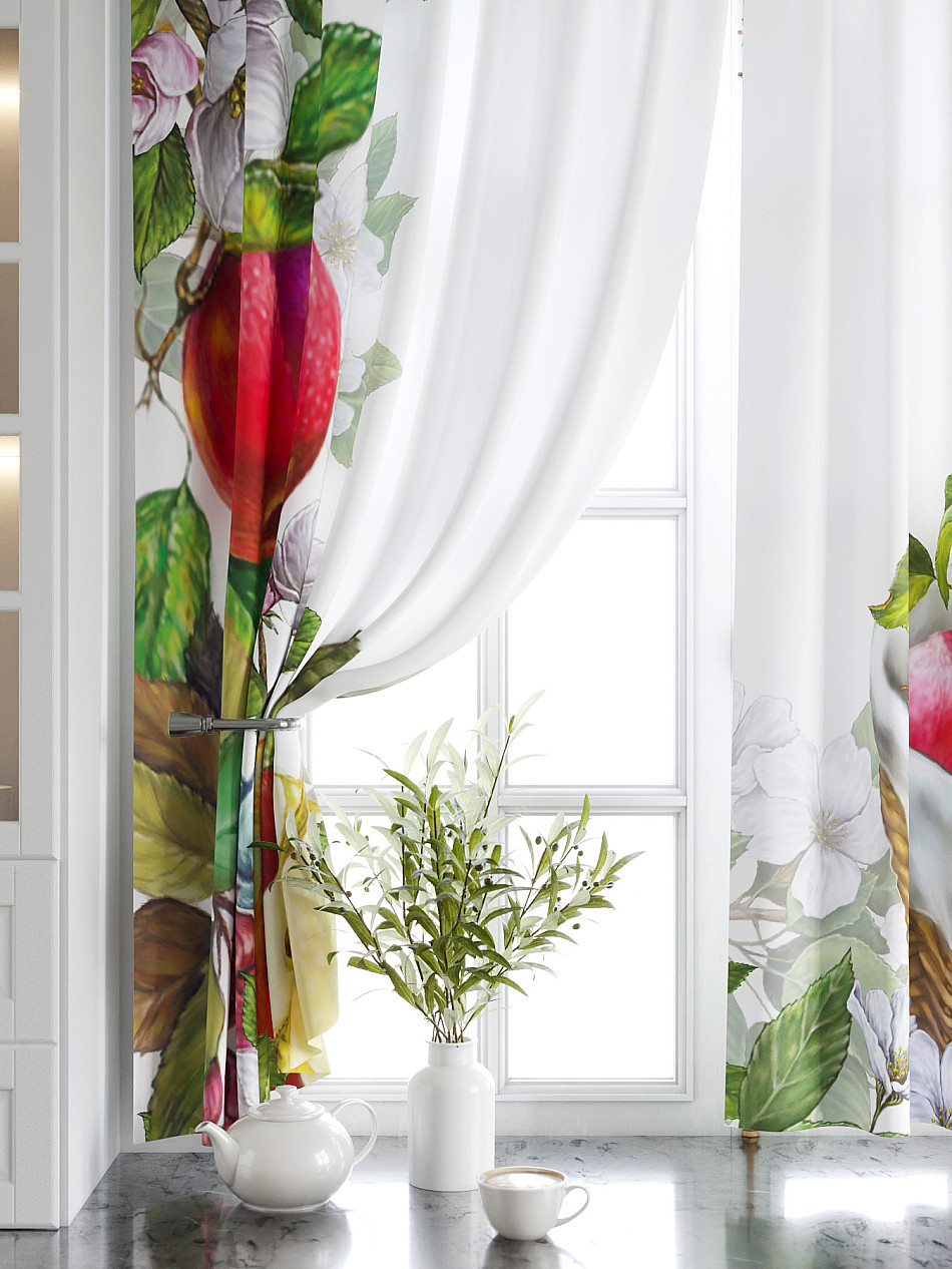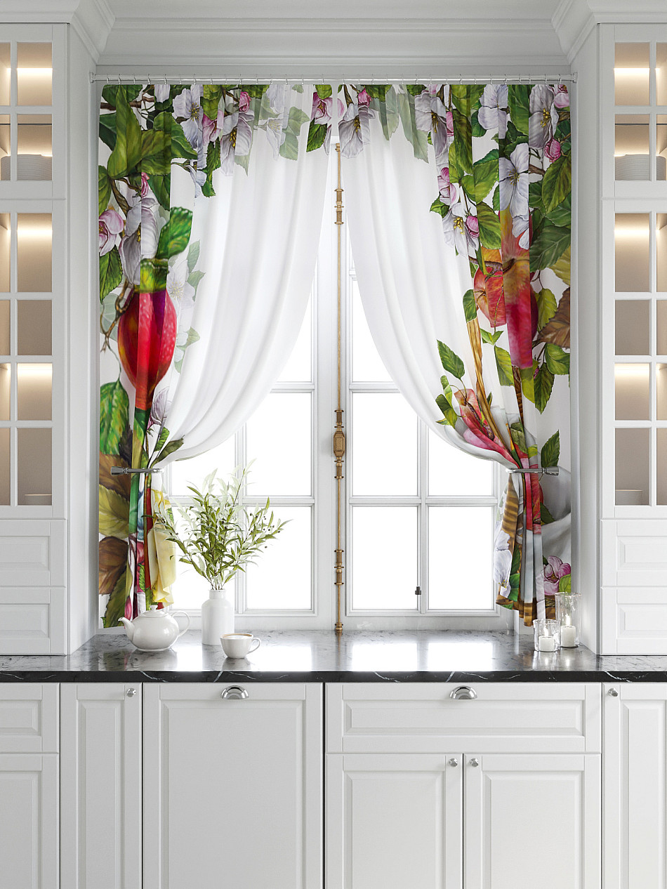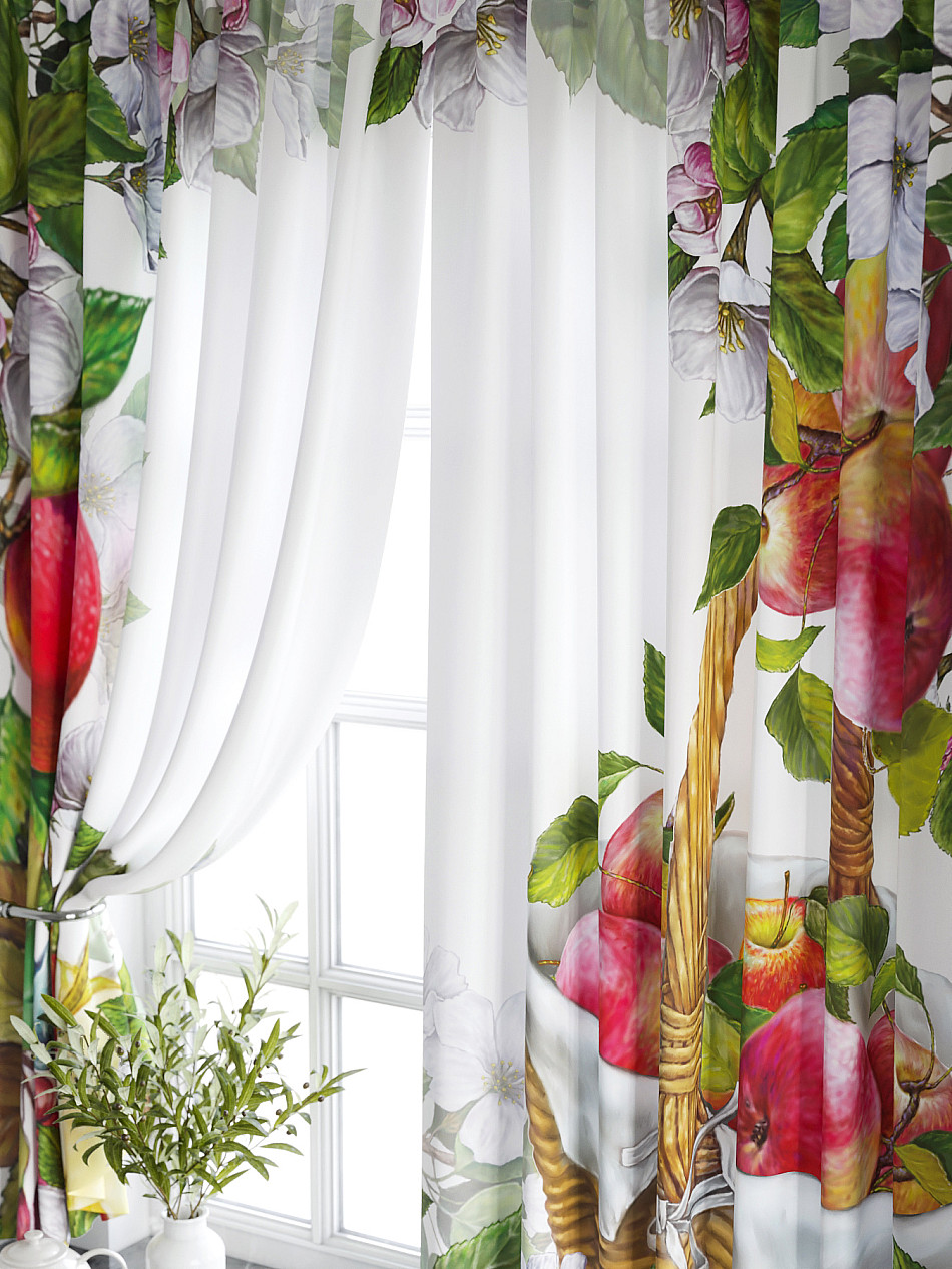 Комплект штор из легкой портьерной ткани (габардин) оформлен печатным рисунком. Печатный рисунок дает широкие возможности обновить интерьер фактически нет требуя ремонта за счет огромного выбора. Ткани с печатным рисунком безопасны и не содержат токсичных веществ. Не смотря на то что, материал легкий, он имеет высокую плотность, мало загрязнятся и не требует особого ухода даже после стирки, что важно для кухонных занавесок. Шторы не выцветают, не растягиваются, превосходно драпируются, образуя струящиеся складки. Прекрасное решение для создания красоты и уюта с помощью уникальных дизайнов.