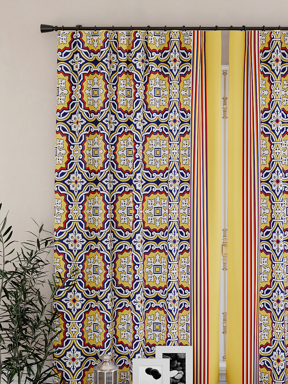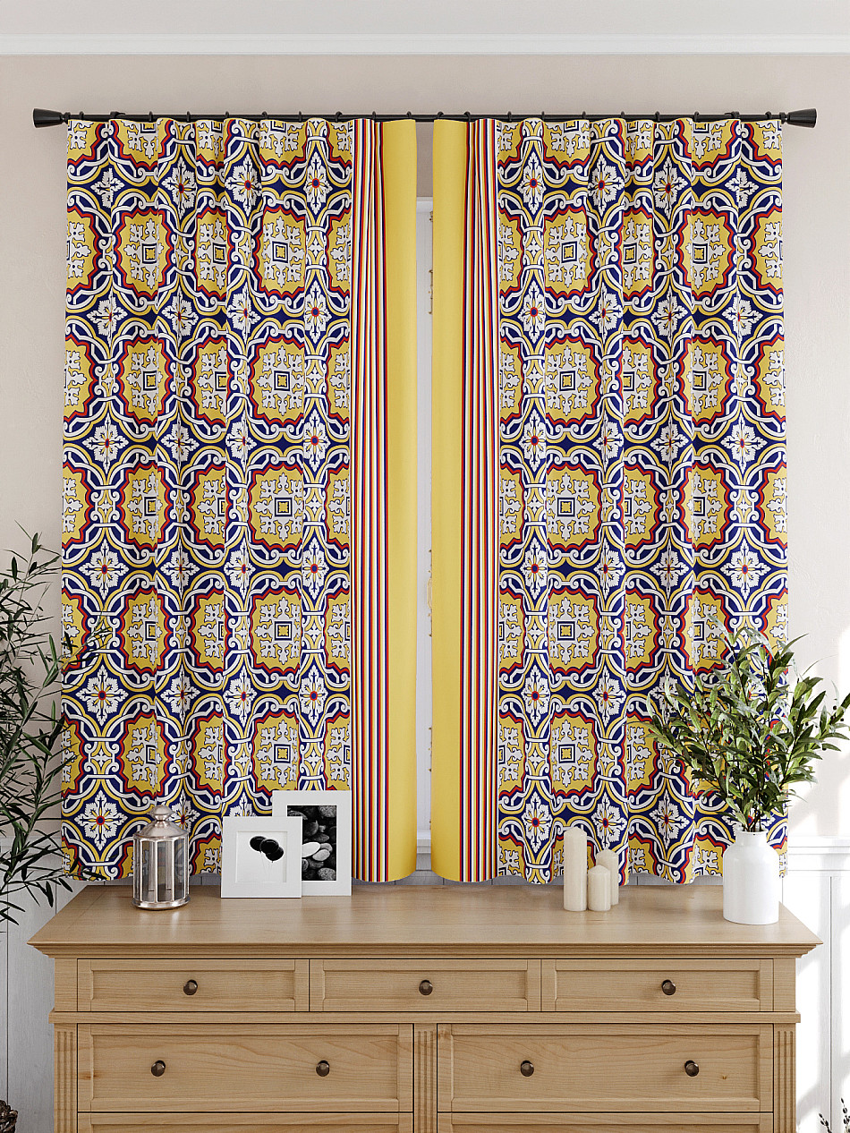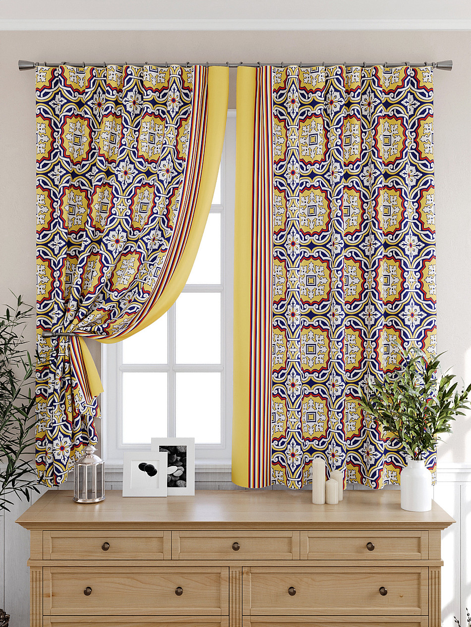 Портьеры 2 шт: Комплект штор из легкой портьерной ткани (габардин) оформлен печатным рисунком. Печатный рисунок дает широкие возможности обновить интерьер фактически нет требуя ремонта за счет огромного выбора. Ткани с печатным рисунком безопасны и не содержат токсичных веществ. Не смотря на то что, материал легкий, он имеет высокую плотность, мало загрязнятся и не требует особого ухода даже после стирки, что важно для кухонных занавесок. Шторы не выцветают, не растягиваются, превосходно драпируются, образуя струящиеся складки. Прекрасное решение для создания красоты и уюта с помощью уникальных дизайнов.