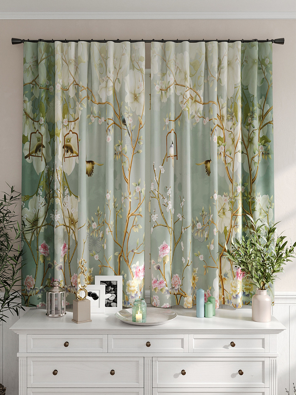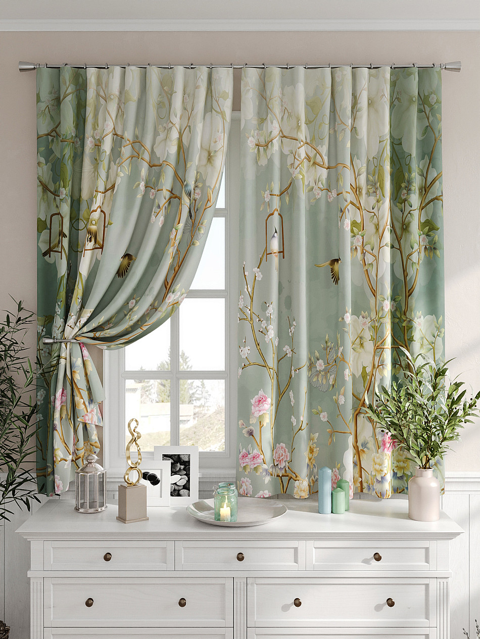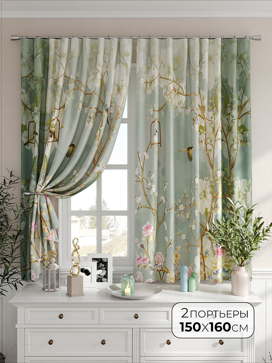 Портьеры 2 шт. Комплект штор из легкой портьерной ткани (габардин) оформлен печатным рисунком. Печатный рисунок дает широкие возможности обновить интерьер фактически не требуя ремонта за счет огромного выбора. Ткани с печатным рисунком безопасны и не содержат токсичных веществ. Не смотря на то, что материал легкий, он имеет высокую плотность, мало загрязнятся и не требует особого ухода даже после стирки, что важно для кухонных занавесок. Шторы не выцветают, не растягиваются, превосходно драпируются, образуя струящиеся складки. Прекрасное решение для создания красоты и уюта с помощью уникальных дизайнов.