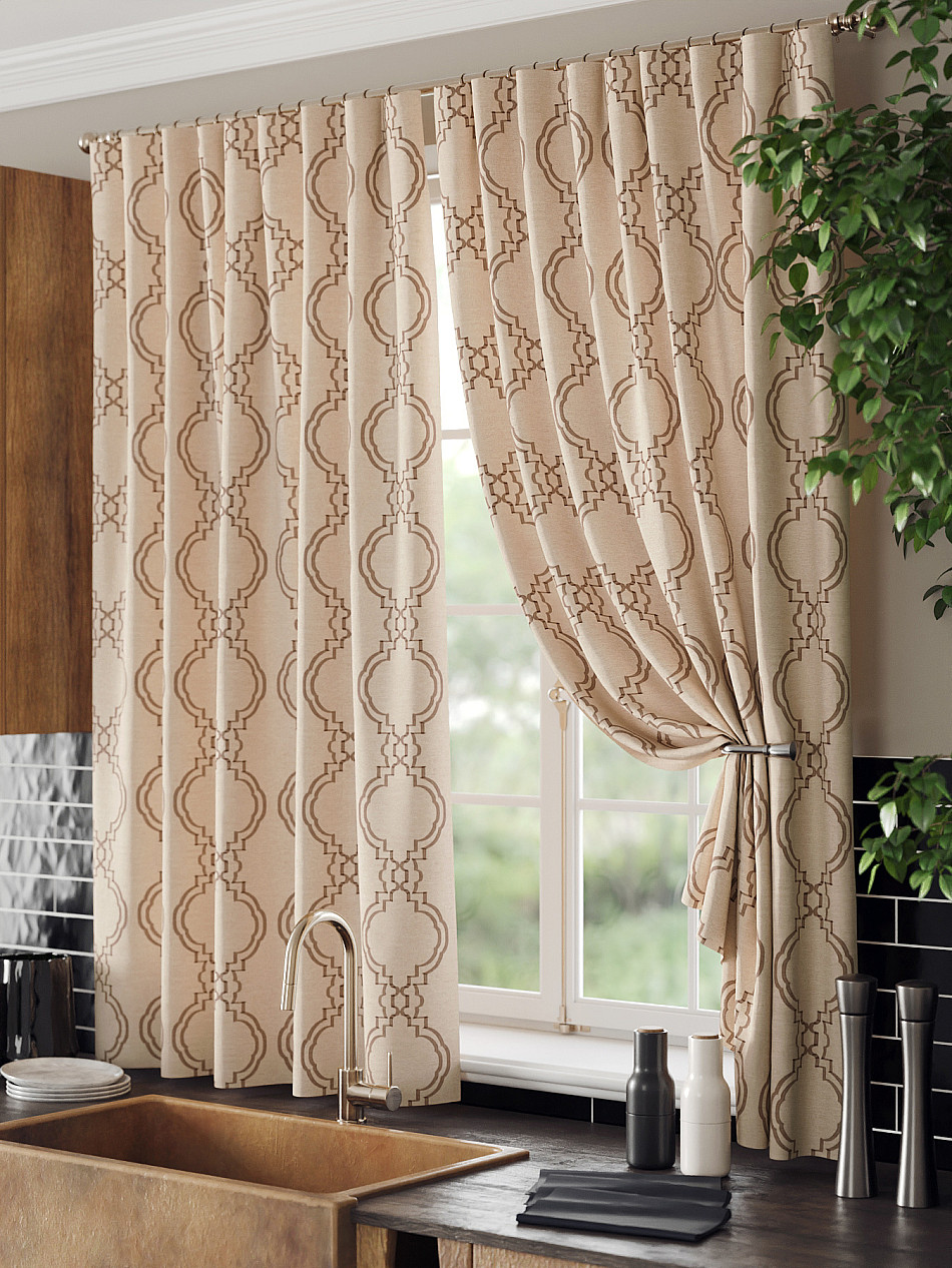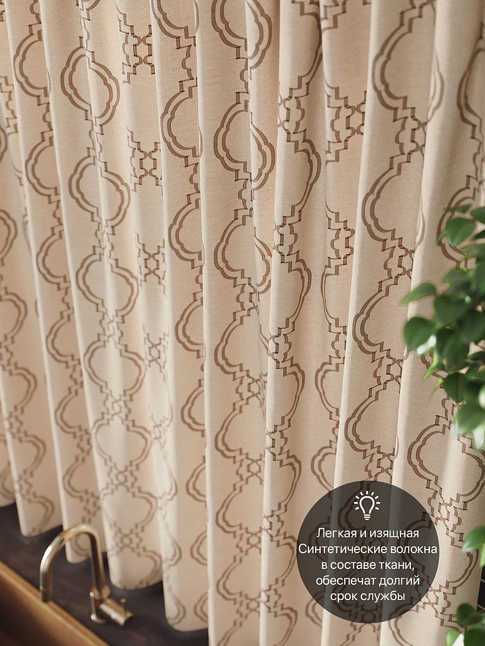 Комплект штор из легкой портьерной ткани (габардин) оформлен печатным рисунком. Печатный рисунок дает широкие возможности обновить интерьер фактически нет требуя ремонта за счет огромного выбора. Ткани с печатным рисунком безопасны и не содержат токсичных веществ. Не смотря на то что, материал легкий, он имеет высокую плотность, мало загрязнятся и не требует особого ухода даже после стирки, что важно для кухонных занавесок. Шторы не выцветают, не растягиваются, превосходно драпируются, образуя струящиеся складки. Прекрасное решение для создания красоты и уюта с помощью уникальных дизайнов.