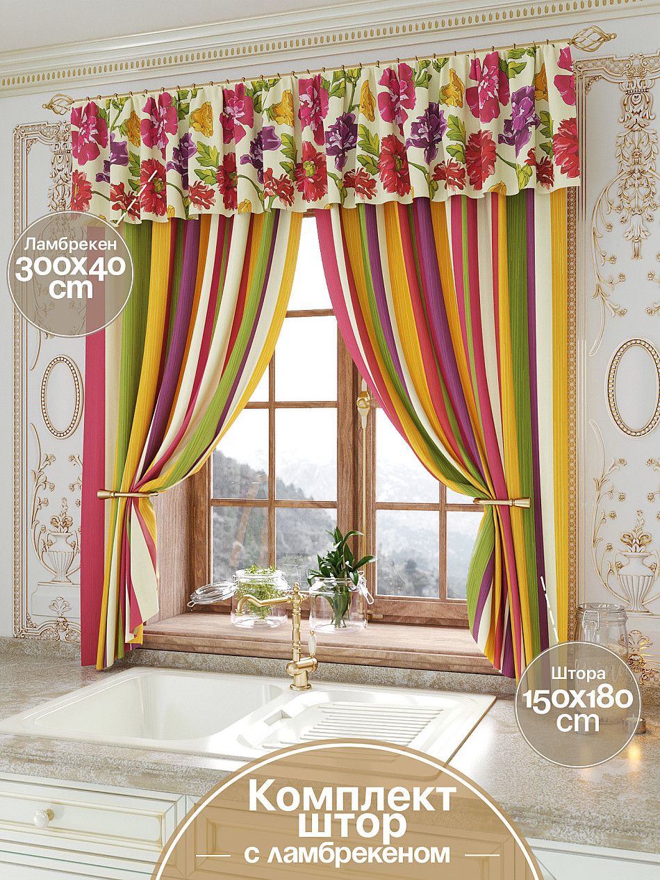 Ламбрекен: легкая основа (Габардин). Ширина — 300 см, высота — 40 см, крепление — шторная лента (крючки).