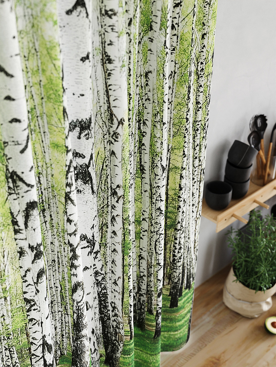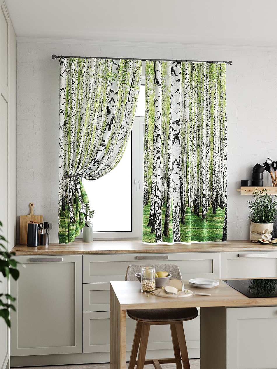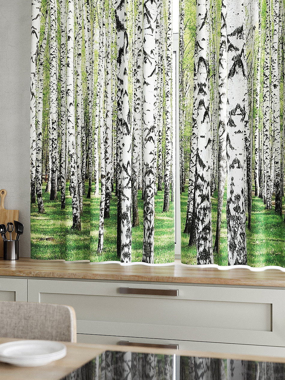 Комплект штор из легкой портьерной ткани (габардин) оформлен печатным рисунком. Печатный рисунок дает широкие возможности обновить интерьер фактически нет требуя ремонта за счет огромного выбора. Ткани с печатным рисунком безопасны и не содержат токсичных веществ. Не смотря на то что, материал легкий, он имеет высокую плотность, мало загрязнятся и не требует особого ухода даже после стирки, что важно для кухонных занавесок. Шторы не выцветают, не растягиваются, превосходно драпируются, образуя струящиеся складки. Прекрасное решение для создания красоты и уюта с помощью уникальных дизайнов.