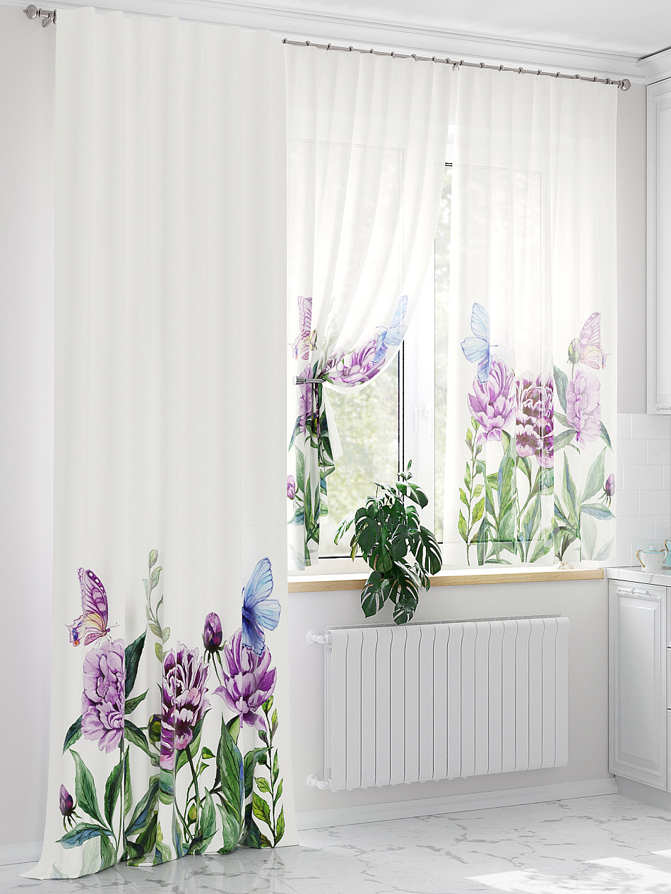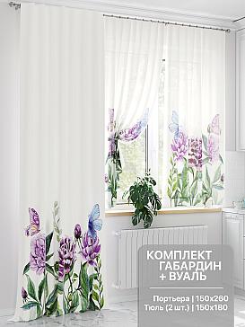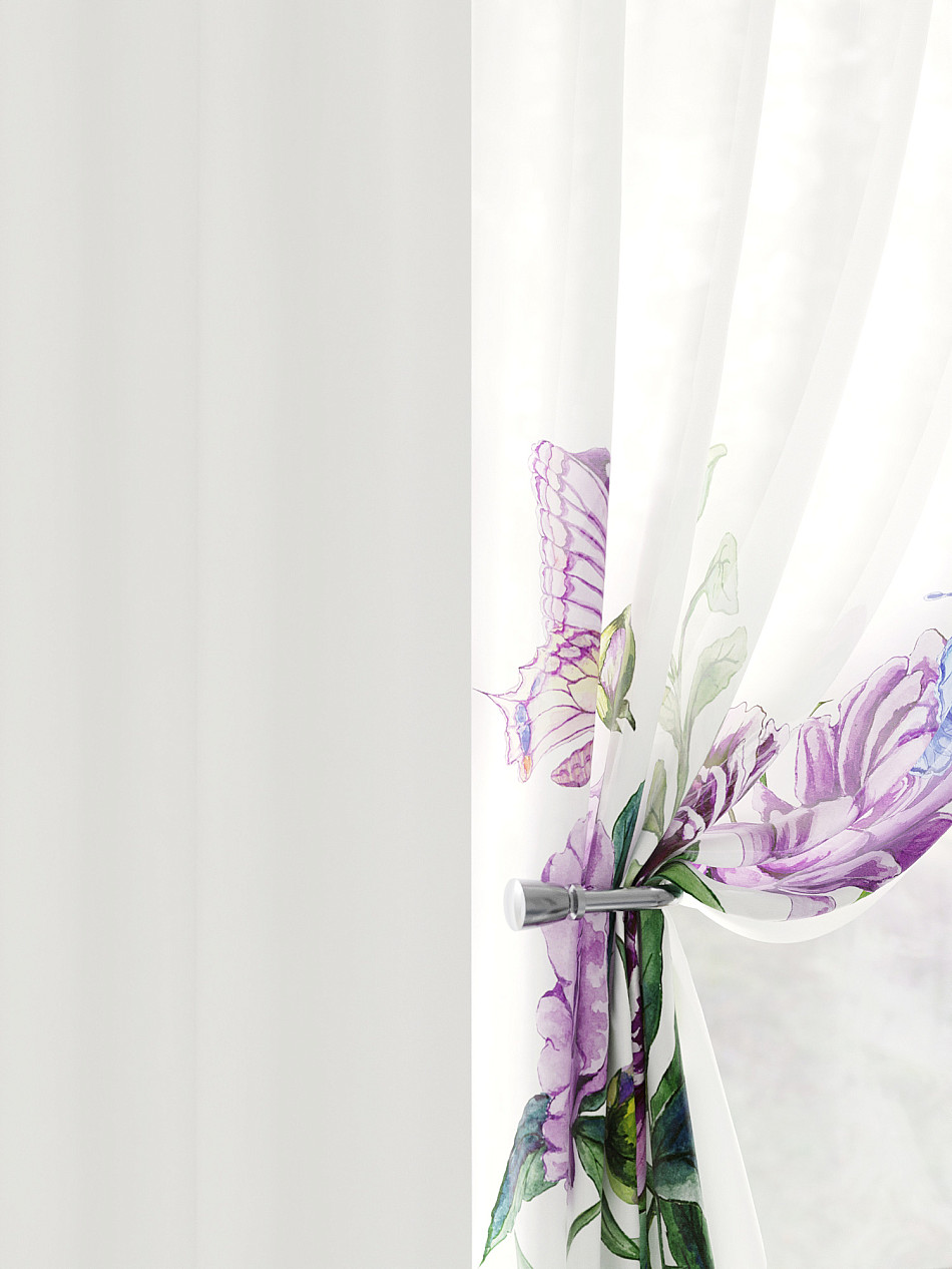Тюль 2 шт.: Легкая основа (вуаль) оформлена флористическим рисунком. Ширина — 150 см., высота — 180 см., крепление — шторная лента (крючки).