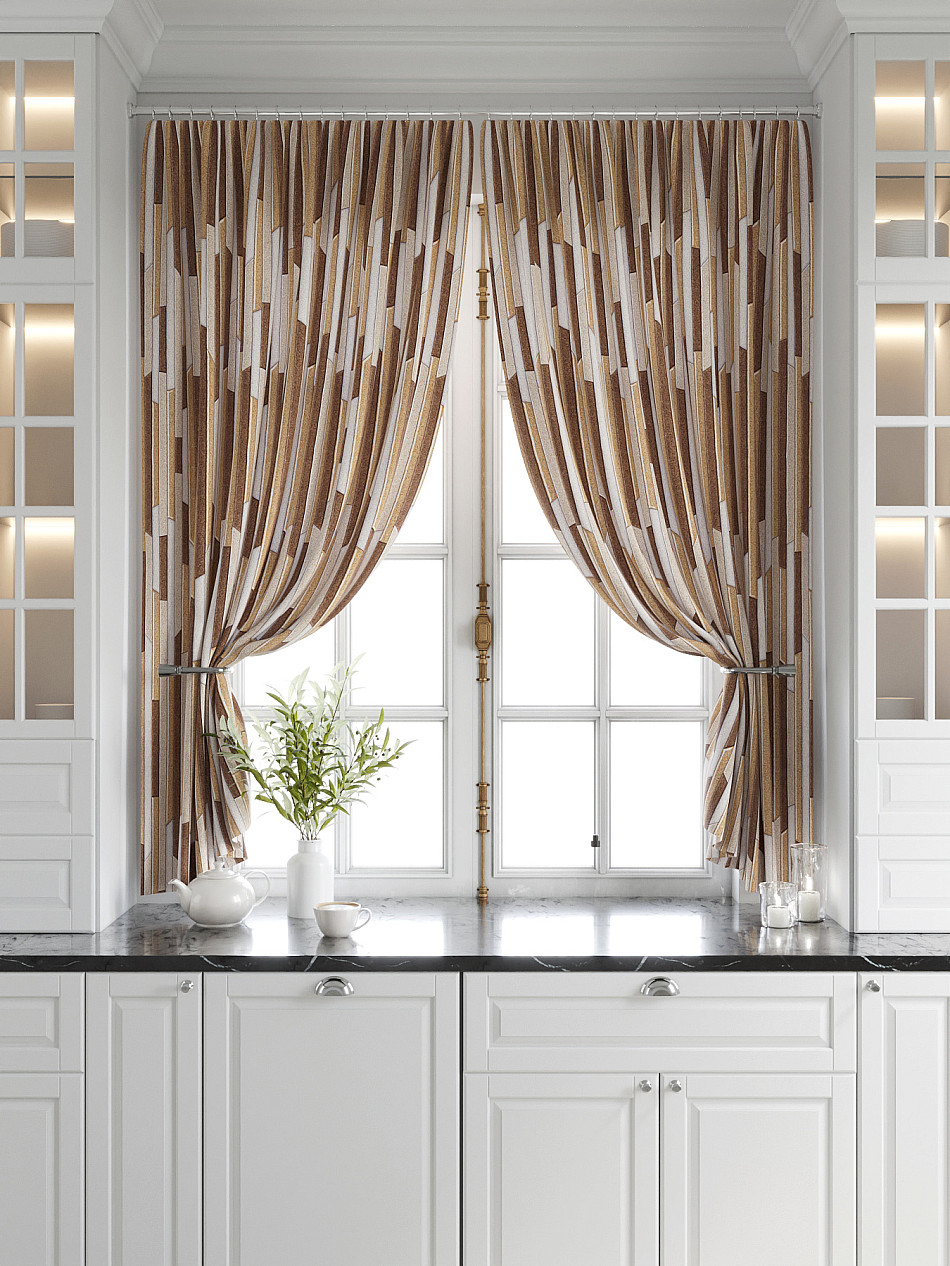 Комплект штор из легкой портьерной ткани (габардин) оформлен печатным рисунком. Печатный рисунок дает широкие возможности обновить интерьер фактически нет требуя ремонта за счет огромного выбора. Ткани с печатным рисунком безопасны и не содержат токсичных веществ. Не смотря на то что, материал легкий, он имеет высокую плотность, мало загрязнятся и не требует особого ухода даже после стирки, что важно для кухонных занавесок. Шторы не выцветают, не растягиваются, превосходно драпируются, образуя струящиеся складки. Прекрасное решение для создания красоты и уюта с помощью уникальных дизайнов.