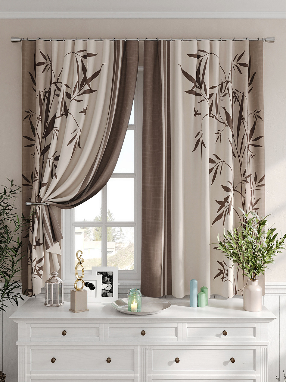 Портьеры 2 шт. Комплект штор из легкой портьерной ткани (габардин) оформлен печатным рисунком. Печатный рисунок дает широкие возможности обновить интерьер фактически не требуя ремонта за счет огромного выбора. Ткани с печатным рисунком безопасны и не содержат токсичных веществ. Не смотря на то, что материал легкий, он имеет высокую плотность, мало загрязнятся и не требует особого ухода даже после стирки, что важно для кухонных занавесок. Шторы не выцветают, не растягиваются, превосходно драпируются, образуя струящиеся складки. Прекрасное решение для создания красоты и уюта с помощью уникальных дизайнов.