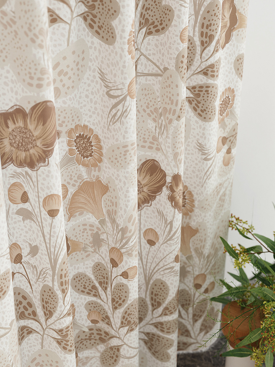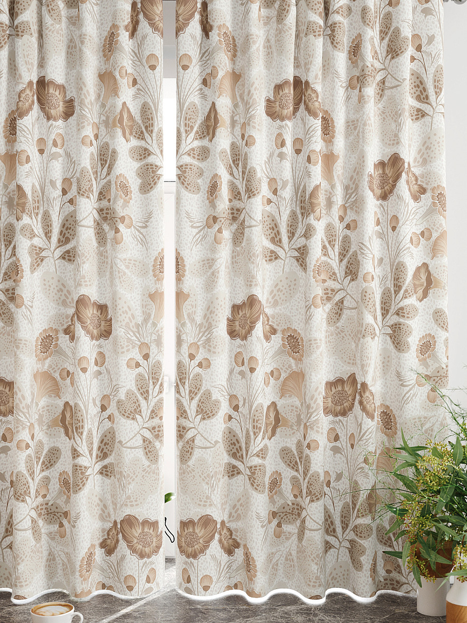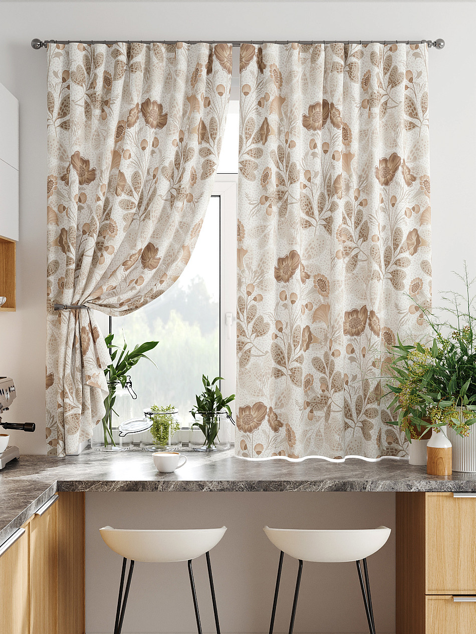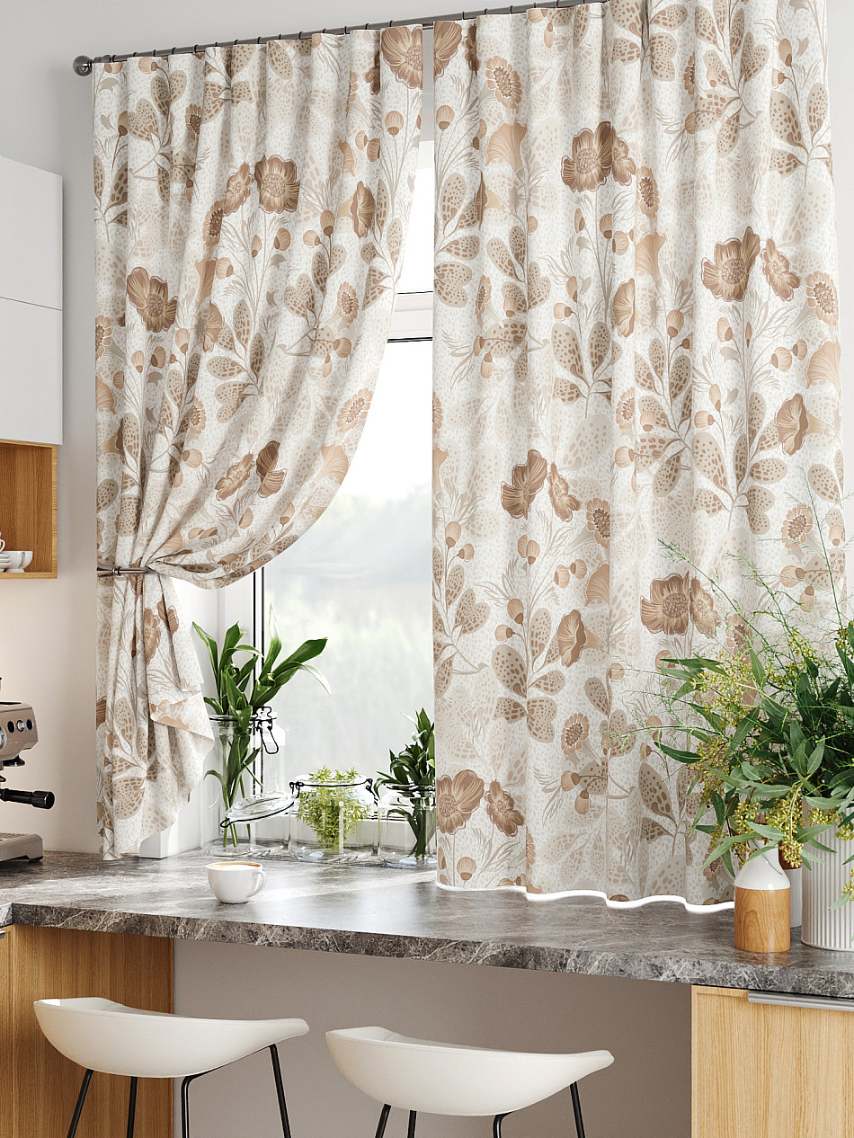 Комплект штор из легкой портьерной ткани (габардин) оформлен печатным рисунком. Печатный рисунок дает широкие возможности обновить интерьер фактически нет требуя ремонта за счет огромного выбора. Ткани с печатным рисунком безопасны и не содержат токсичных веществ. Не смотря на то что, материал легкий, он имеет высокую плотность, мало загрязнятся и не требует особого ухода даже после стирки, что важно для кухонных занавесок. Шторы не выцветают, не растягиваются, превосходно драпируются, образуя струящиеся складки. Прекрасное решение для создания красоты и уюта с помощью уникальных дизайнов.