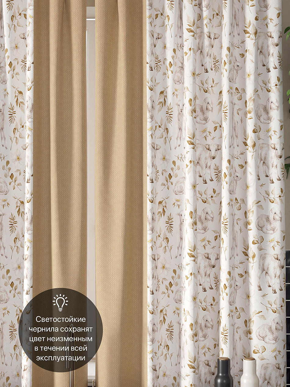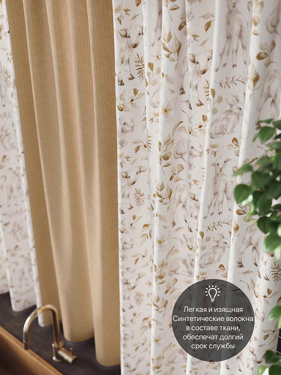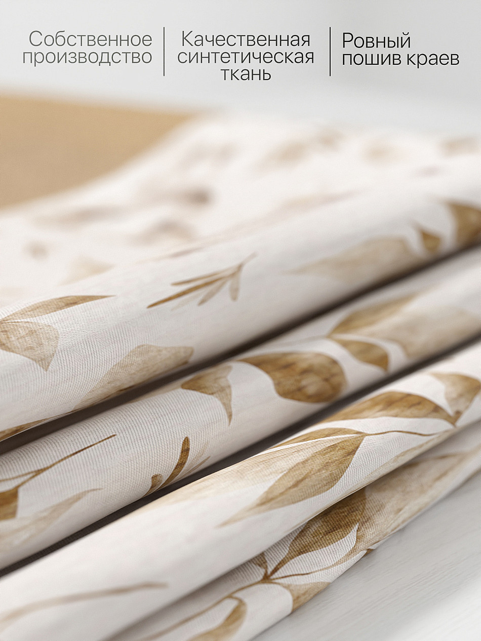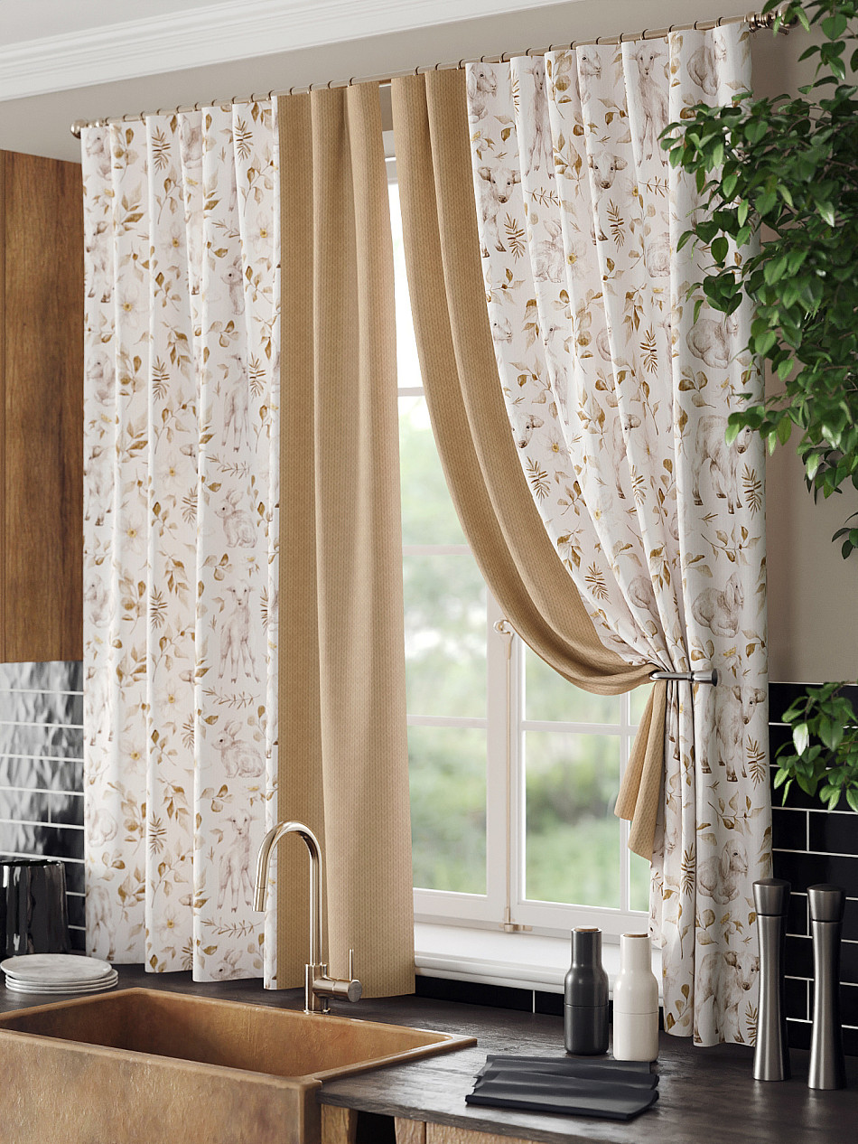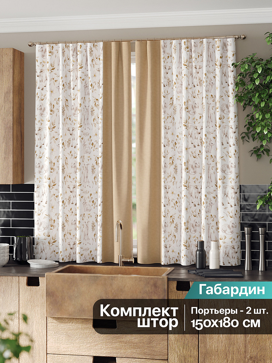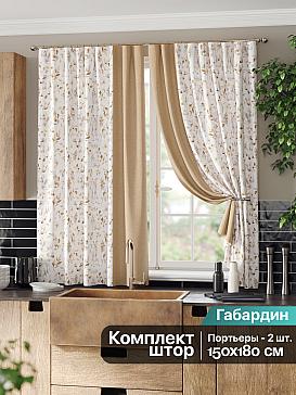 Комплект штор из легкой портьерной ткани (габардин) оформлен печатным рисунком. Печатный рисунок дает широкие возможности обновить интерьер фактически нет требуя ремонта за счет огромного выбора. Ткани с печатным рисунком безопасны и не содержат токсичных веществ. Не смотря на то что, материал легкий, он имеет высокую плотность, мало загрязнятся и не требует особого ухода даже после стирки, что важно для кухонных занавесок. Шторы не выцветают, не растягиваются, превосходно драпируются, образуя струящиеся складки. Прекрасное решение для создания красоты и уюта с помощью уникальных дизайнов.