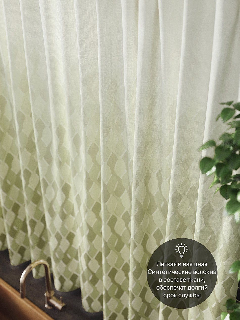 Комплект штор из легкой портьерной ткани (габардин) оформлен печатным рисунком. Печатный рисунок дает широкие возможности обновить интерьер фактически нет требуя ремонта за счет огромного выбора. Ткани с печатным рисунком безопасны и не содержат токсичных веществ. Не смотря на то что, материал легкий, он имеет высокую плотность, мало загрязнятся и не требует особого ухода даже после стирки, что важно для кухонных занавесок. Шторы не выцветают, не растягиваются, превосходно драпируются, образуя струящиеся складки. Прекрасное решение для создания красоты и уюта с помощью уникальных дизайнов.