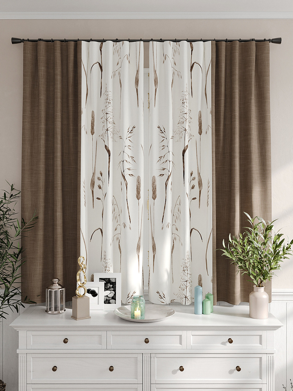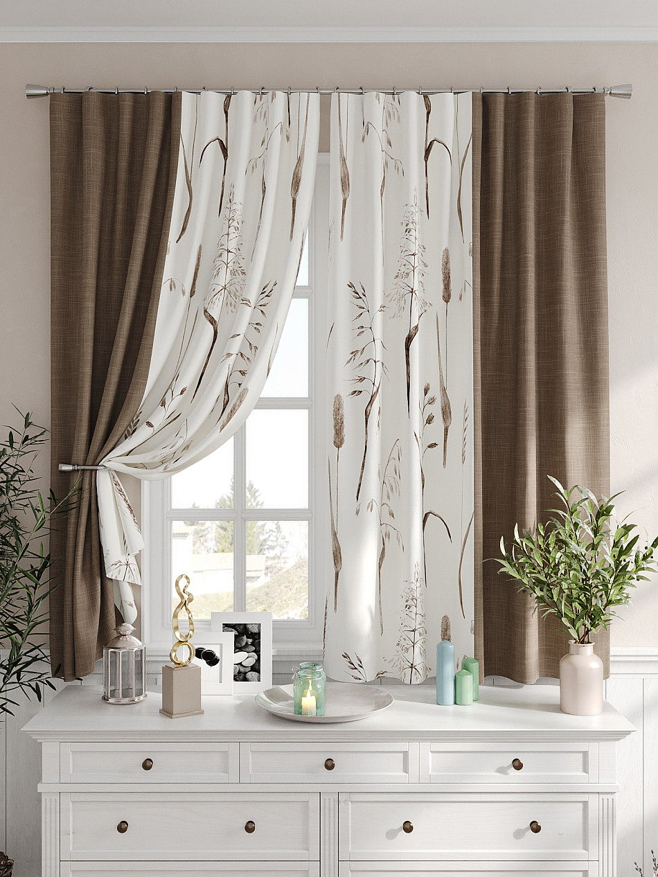 Портьеры 2 шт. Комплект штор из легкой портьерной ткани (габардин) оформлен печатным рисунком. Печатный рисунок дает широкие возможности обновить интерьер фактически не требуя ремонта за счет огромного выбора. Ткани с печатным рисунком безопасны и не содержат токсичных веществ. Не смотря на то, что материал легкий, он имеет высокую плотность, мало загрязнятся и не требует особого ухода даже после стирки, что важно для кухонных занавесок. Шторы не выцветают, не растягиваются, превосходно драпируются, образуя струящиеся складки. Прекрасное решение для создания красоты и уюта с помощью уникальных дизайнов.
