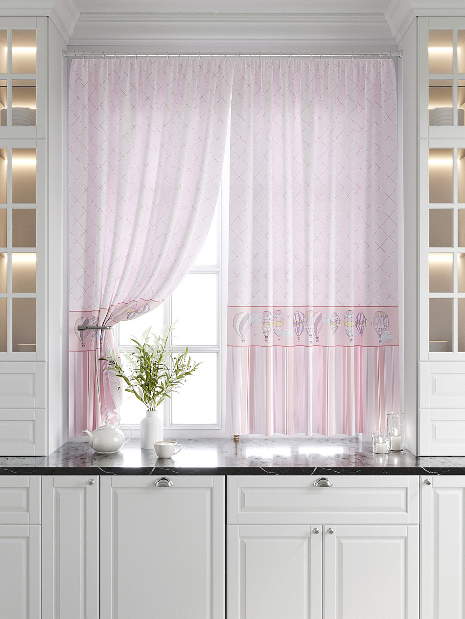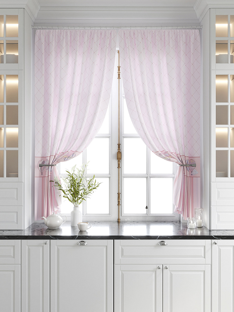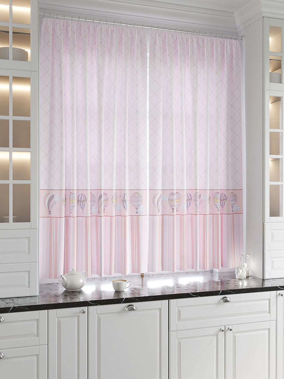 Комплект штор из легкой портьерной ткани (габардин) оформлен печатным рисунком. Печатный рисунок дает широкие возможности обновить интерьер фактически нет требуя ремонта за счет огромного выбора. Ткани с печатным рисунком безопасны и не содержат токсичных веществ. Не смотря на то что, материал легкий, он имеет высокую плотность, мало загрязнятся и не требует особого ухода даже после стирки, что важно для кухонных занавесок. Шторы не выцветают, не растягиваются, превосходно драпируются, образуя струящиеся складки. Прекрасное решение для создания красоты и уюта с помощью уникальных дизайнов.