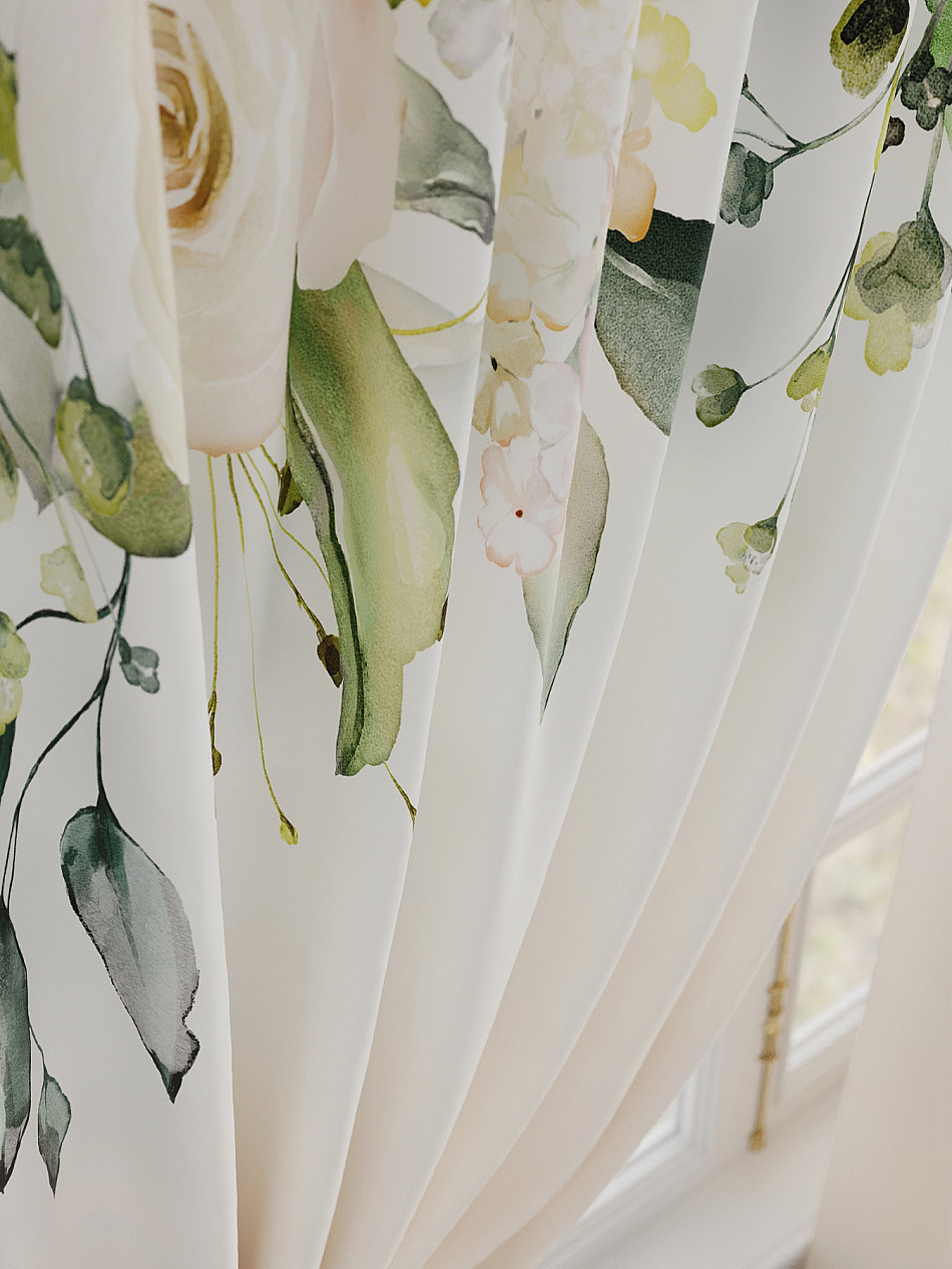 По верхнему краю портьер пришита шторная тесьма 6 см, с ее помощью затянув узелки от кордовых нитей с обеих сторон и стянув их до нужного размера можно сформировать округлые складки, далее вставить крючки в кармашки и повесить на карниз. Обязательно проверьте кордовые нити – они должны быть надежно завязаны, в противном случае во время стягивания они могут вылететь. Шторная тесьма имеет два ряда кармашков, с их помощью можно регулировать не только длину, но и ширину. Такое крепление подходит для всех типов карнизов.
