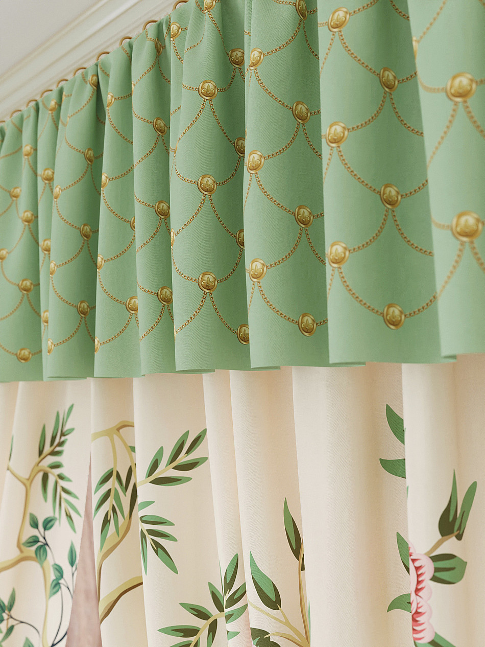 Ламбрекен: легкая основа (Габардин). Ширина — 300 см, высота — 40 см, крепление — шторная лента (крючки).
