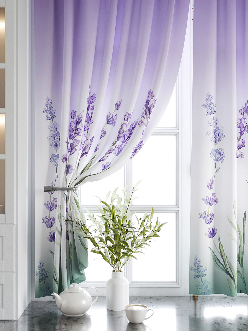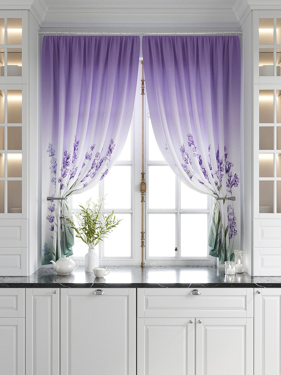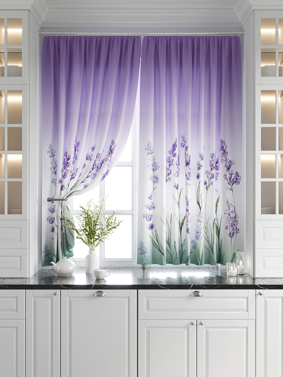 Комплект штор из легкой портьерной ткани (габардин) оформлен печатным рисунком. Печатный рисунок дает широкие возможности обновить интерьер фактически нет требуя ремонта за счет огромного выбора. Ткани с печатным рисунком безопасны и не содержат токсичных веществ. Не смотря на то что, материал легкий, он имеет высокую плотность, мало загрязнятся и не требует особого ухода даже после стирки, что важно для кухонных занавесок. Шторы не выцветают, не растягиваются, превосходно драпируются, образуя струящиеся складки. Прекрасное решение для создания красоты и уюта с помощью уникальных дизайнов.