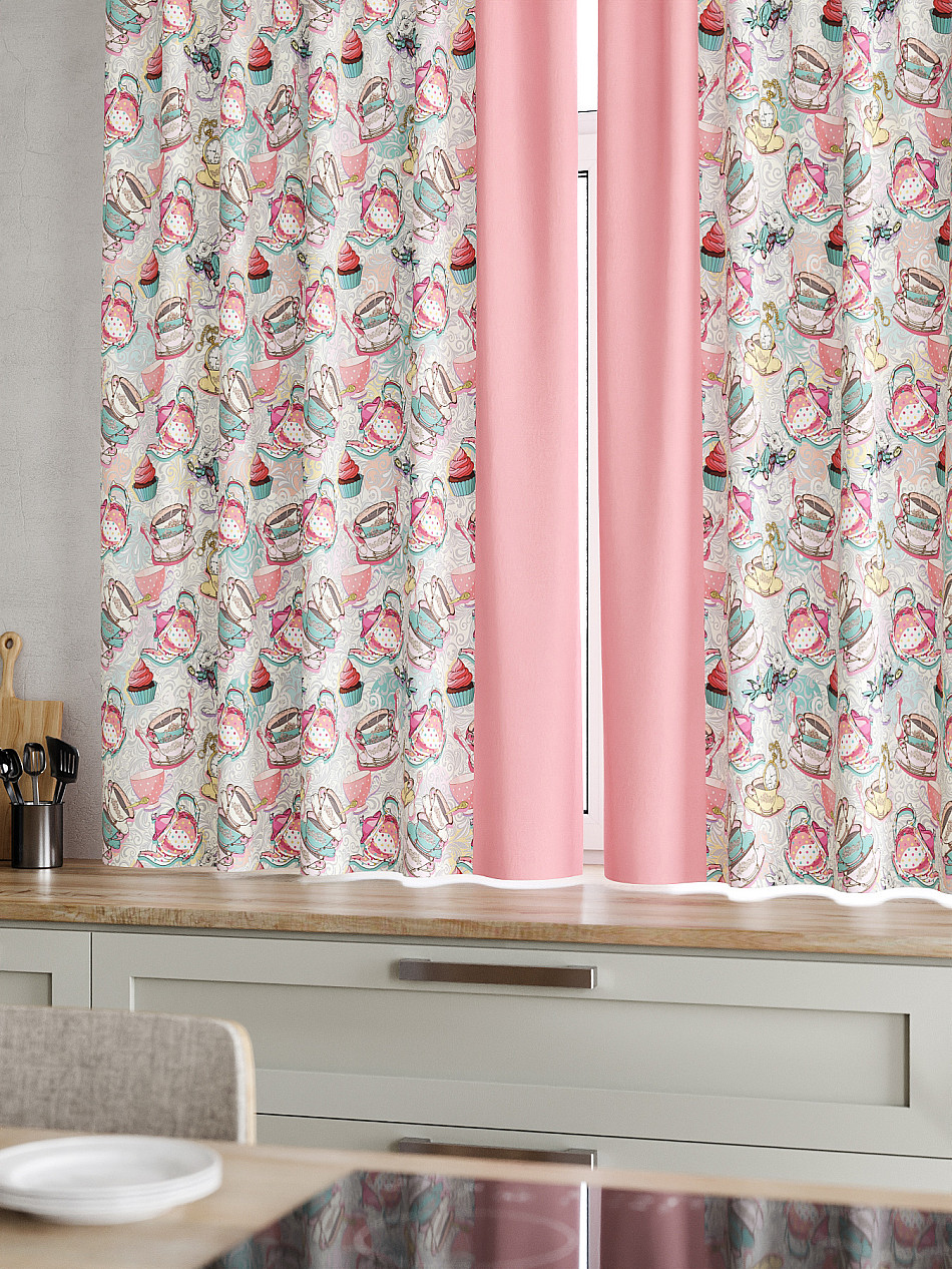 Комплект штор из легкой портьерной ткани (габардин) оформлен печатным рисунком. Печатный рисунок дает широкие возможности обновить интерьер фактически нет требуя ремонта за счет огромного выбора. Ткани с печатным рисунком безопасны и не содержат токсичных веществ. Не смотря на то что, материал легкий, он имеет высокую плотность, мало загрязнятся и не требует особого ухода даже после стирки, что важно для кухонных занавесок. Шторы не выцветают, не растягиваются, превосходно драпируются, образуя струящиеся складки. Прекрасное решение для создания красоты и уюта с помощью уникальных дизайнов.