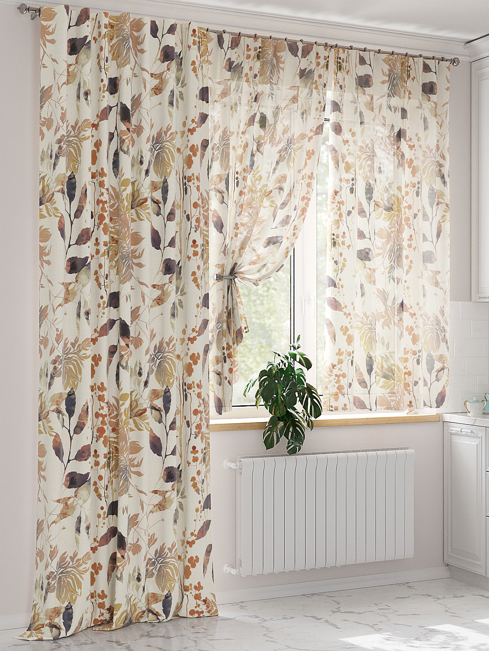 Тюль 2 шт.: Легкая основа (вуаль) оформлена растительным рисунком. Ширина — 150 см., высота — 180 см., крепление — шторная лента (крючки).