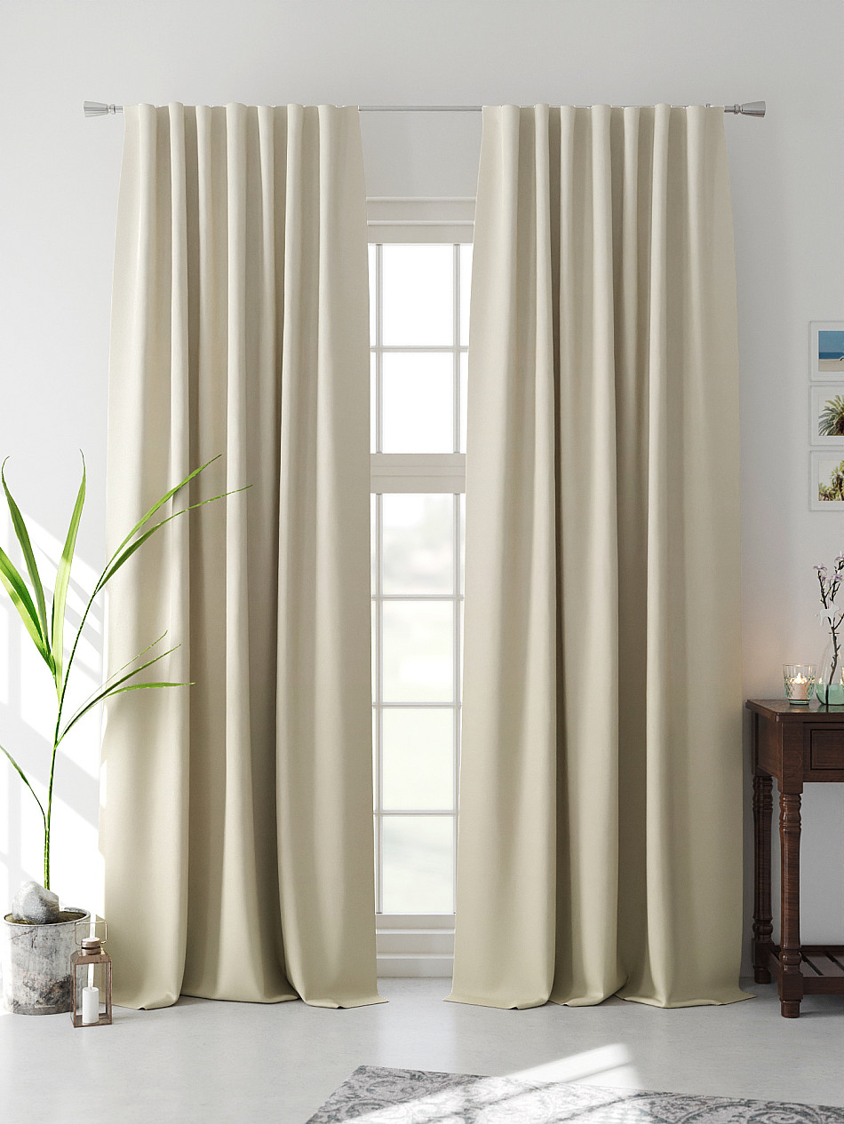 По верхнему краю портьер пришита шторная тесьма 6 см, с ее помощью затянув узелки от кордовых нитей с обеих сторон и стянув их до нужного размера можно сформировать округлые складки, далее вставить крючки в кармашки и повесить на карниз. Обязательно проверьте кордовые нити – они должны быть надежно завязаны, в противном случае во время стягивания они могут вылететь. Шторная тесьма имеет два ряда кармашков, с их помощью можно регулировать не только длину, но и ширину. Такое крепление подходит для всех типов карнизов.